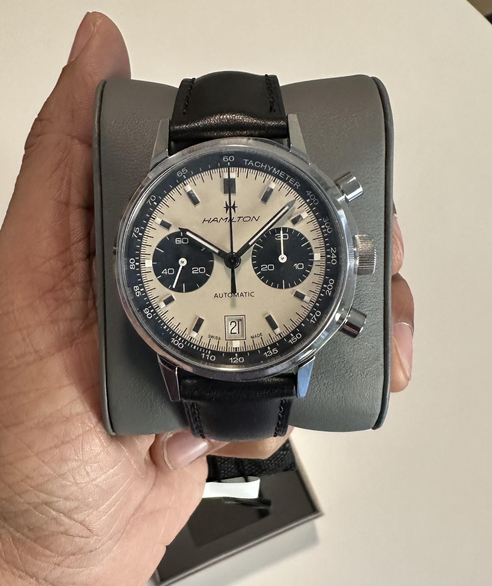 **Selling a Hamilton Intra-Matic Chronograph** (more photos in imgur link below). \--- Condition: **brand new in box** (still with stickers & tags). Includes: **Full set** \- original Hamilton leather strap, Hamilton date-pusher tool, inner box and watch cushion, outer box, instruction manual, and warranty card. This watch **WILL be covered by Hamilton's 2-year manufacturer warranty** (starting from 3/8/26). Asking price: **$1,950** (compare to $2,600 retail, or $1,912 + tax and no warrant...