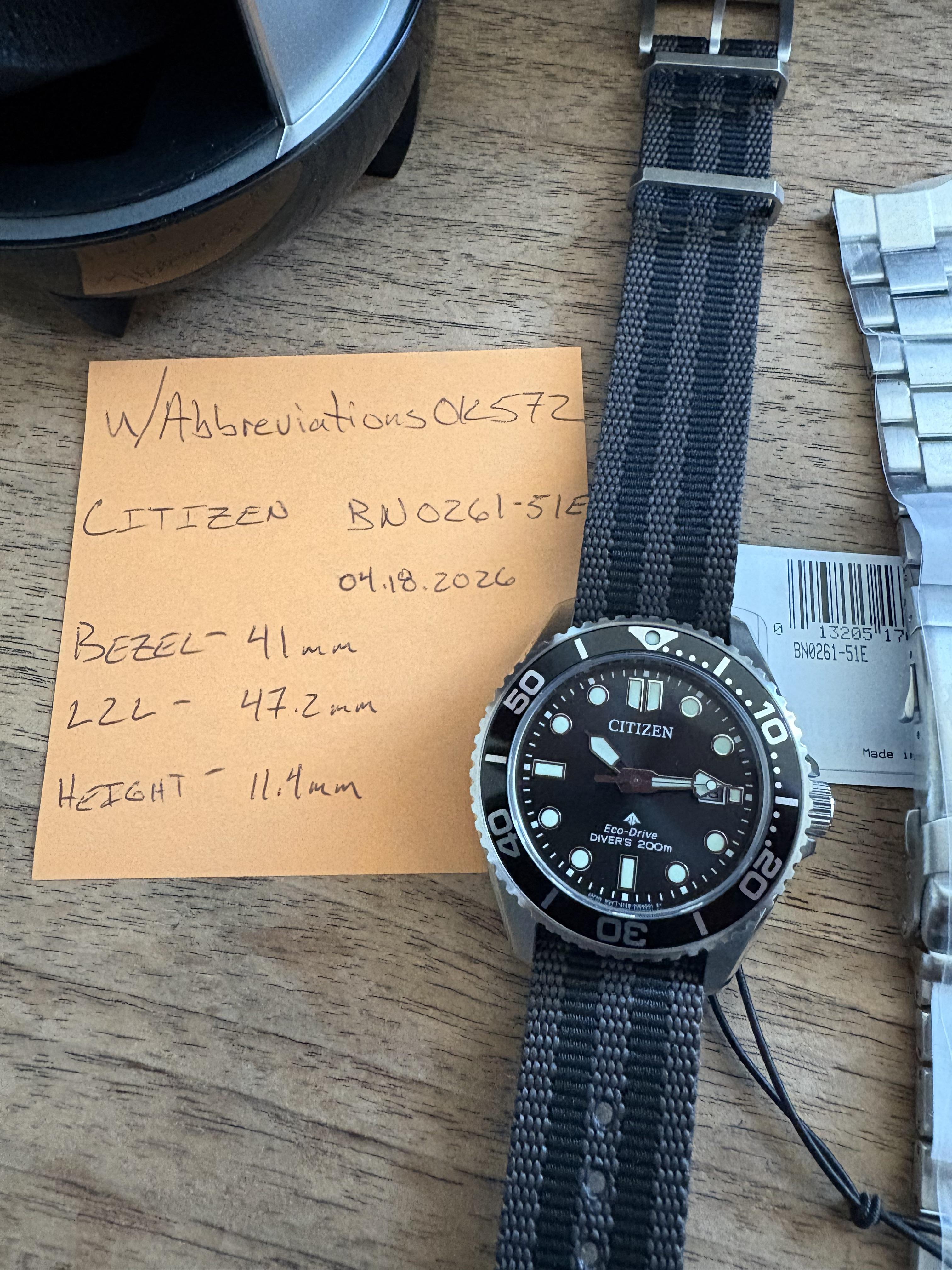 Hey WatchExchange! Up is my Citizen Promaster BN0261-51E. 41mm eco-drive quartz in excellent shape. Full kit: box, tank, hang tag, and bracelet. Bracelet is unworn and still has factory plastic/paper on, pictured nato is included as well. $200 shipped CONUS. Zelle or PayPal preferred. Always happy to FaceTime or send more pictures. Thanks for looking!