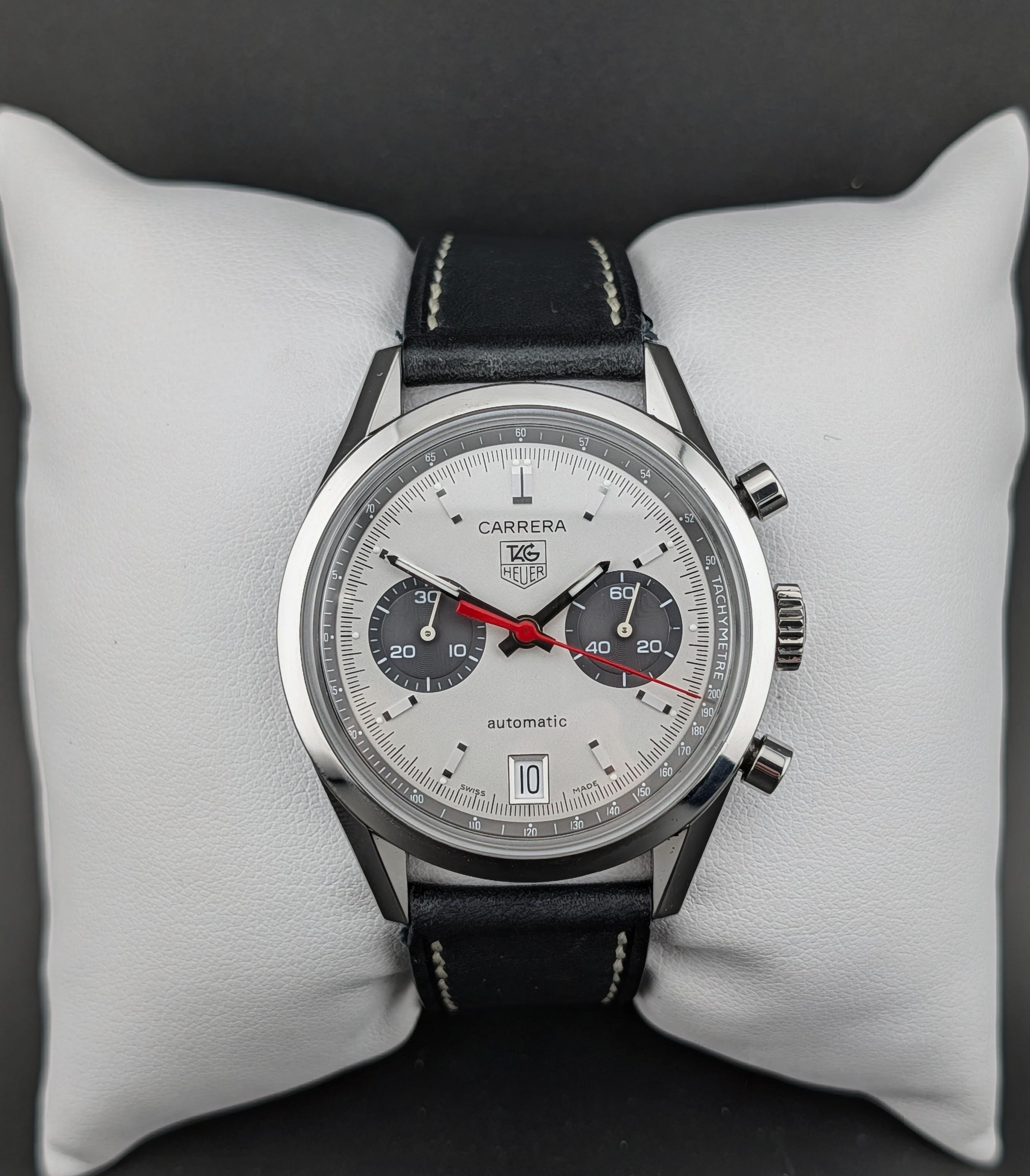 Up for sale is the highly sought-after TAG Heuer Carrera CV2117, a beautiful modern tribute to the original 1964 Carrera. This specific model was limited to only 1,964 pieces worldwide and features a distinctive silver dial with contrasting dark-grey "panda" sub-dials and a signature red chronograph hand. Condition & Performance: Case: Excellent pre-owned condition with minimal to no signs of wear. Movement: Running very strong at an impressive +6 seconds/day. Crystal: Clean sapphire crystal w...