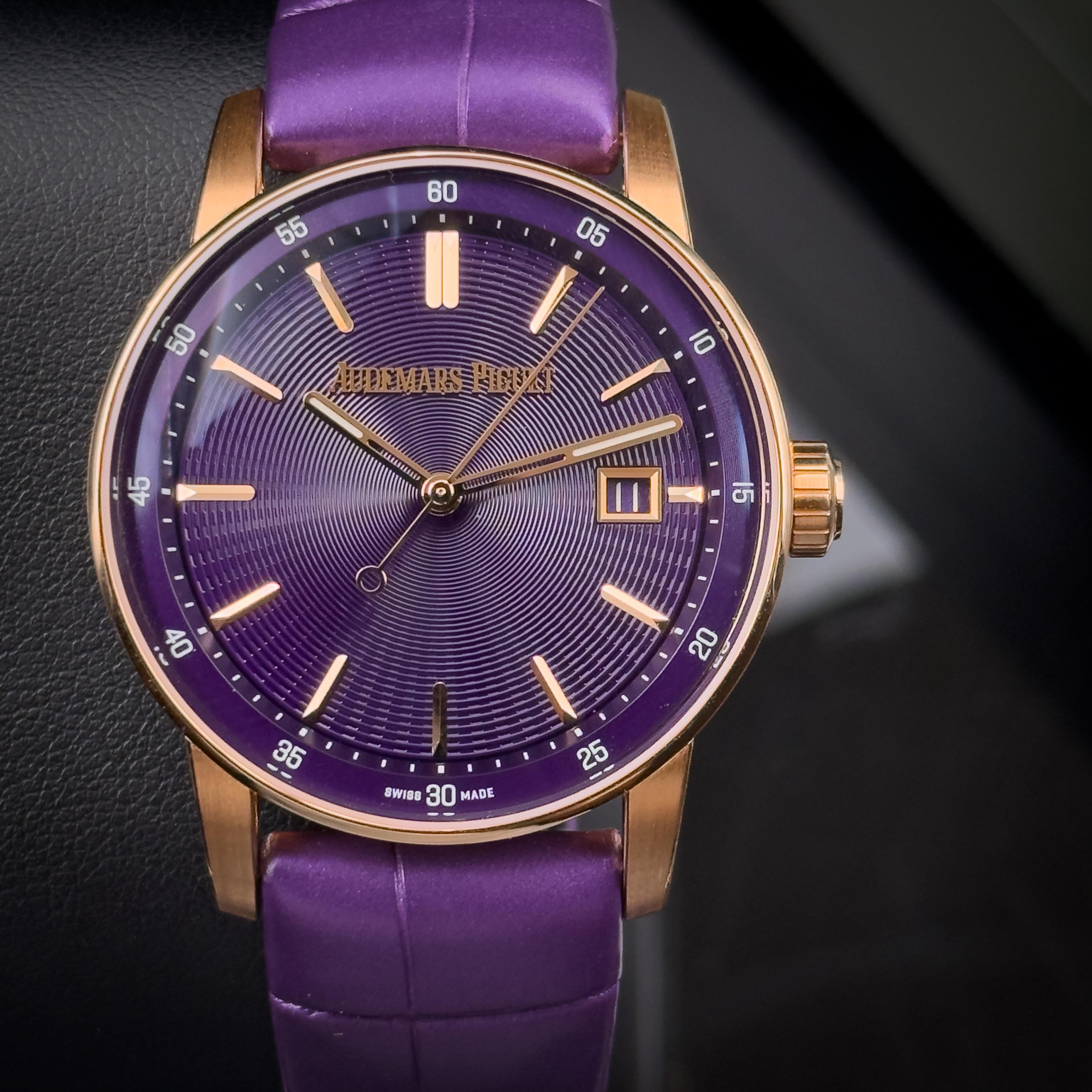 2025 Audemars Piguet Code 11.59 18k Rose Gold Purple Dial 77410OR.OO.A623CR.01 New/Unworn Complete Set PRICE: $25,850 + Label Coming as a COMPLETE full set, dated warranty from 02/2025. The watch is coming in unworn like new condition, covered under factory warranty until 02/2030. Also included is a complimentary service from AP. Own the room with this one. Sculpted out of a 38mm rose gold case, with an octagonal core cut out of a tradition round case. A true testament to Audemars manufa...