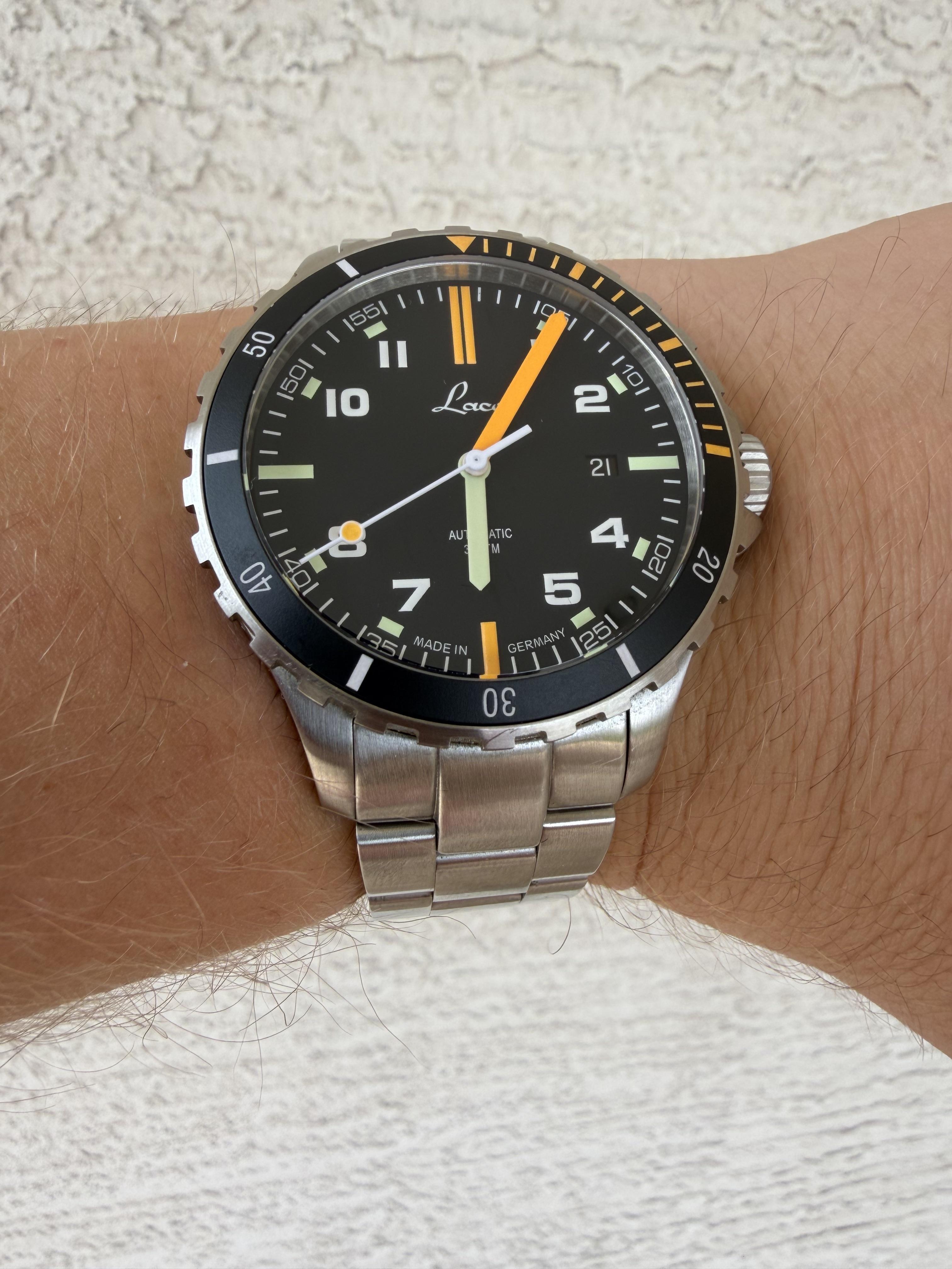 Laco Mojave Scorpion MB Men’s watch Code: 862109.MB 42mm in size Link to specs: https://www.laco-watches.com/en/watches/sport-watches/mojave-42-mb/862109.mb Condition: In great pre-owned shape. Some desk diving scratches on the bracelet. Crystal is in perfect shape. It comes on the original Laco bracelet sized to 7.25in with 3 extra links. Also comes with original outer box and cards pictured. $525 shipped anywhere in the US. I accept Zelle, Venmo, or PayPal F&F. Timestamp: https://imgur....