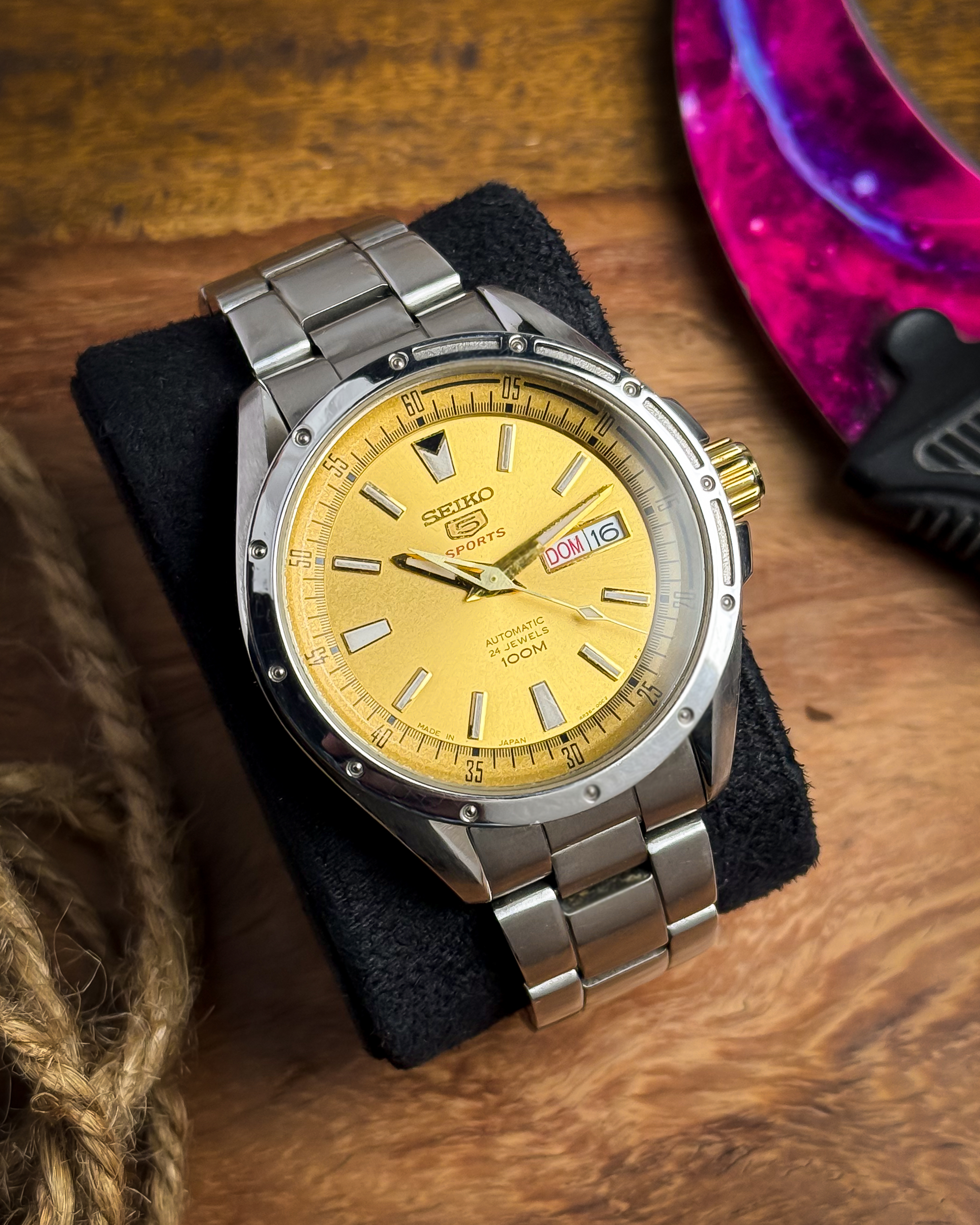 [Timestamp](https://drive.google.com/file/d/19gjb19ffy8bkicPH7o_5crg8LlA-8HAT/view?usp=sharing) Up for sale is a stunningย **Seiko 5 Sports (4R36-00E0)**ย from July 2011. This is an exceptionally clean example of Seiko's high-spec "5 Sports" line, featuring a radiantย **Golden Sunburst Dial**ย that offers a premium look rarely seen in tool watches. The dial is highly legible withย **lume-filled baton indices**ย and classicย **dauphine hands**, also filled with lume for low-light visibility. An i...