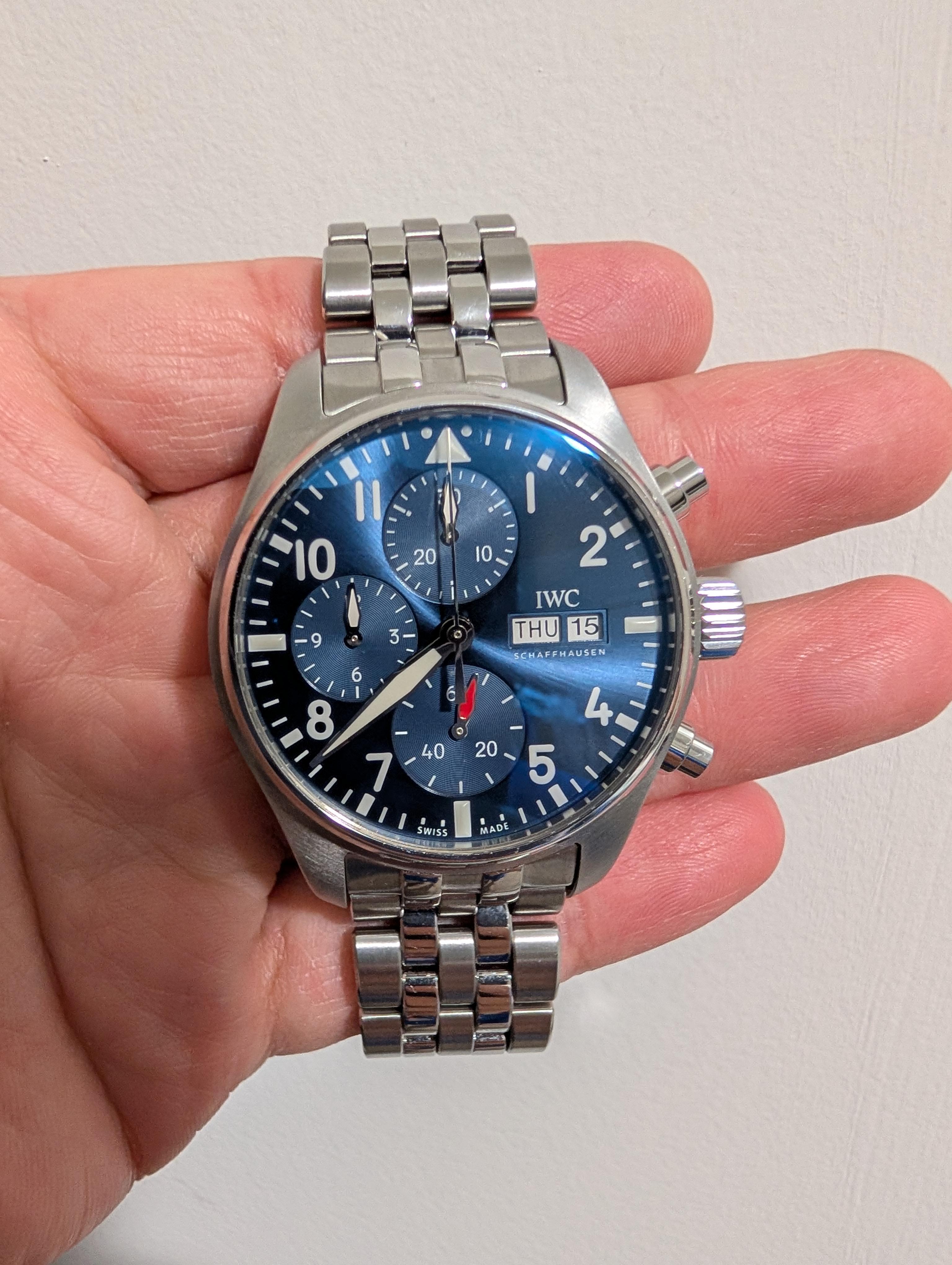Selling my IWC Blue 41 mm Pilot's Chronograph (IW388102)! Photos: [https://www.dropbox.com/scl/fo/6s0ffdmdd9u8ejraw2dme/AI7M-J2DrHnc14CC9nu\_-aw?rlkey=yn39wkwg5kawsob8b5rkf596j&st=84onqr7n&dl=0](https://www.dropbox.com/scl/fo/6s0ffdmdd9u8ejraw2dme/AI7M-J2DrHnc14CC9nu_-aw?rlkey=yn39wkwg5kawsob8b5rkf596j&st=84onqr7n&dl=0) Timestamp: [https://www.dropbox.com/scl/fi/jf33zcwg5j2lnxazgseqk/PXL\_20260415\_022908142.jpg?rlkey=m5nl7mfaqevpvju565cnmvxbs&st=dpbw1737&dl=0](https://www.dropbox.com/scl/fi/j...