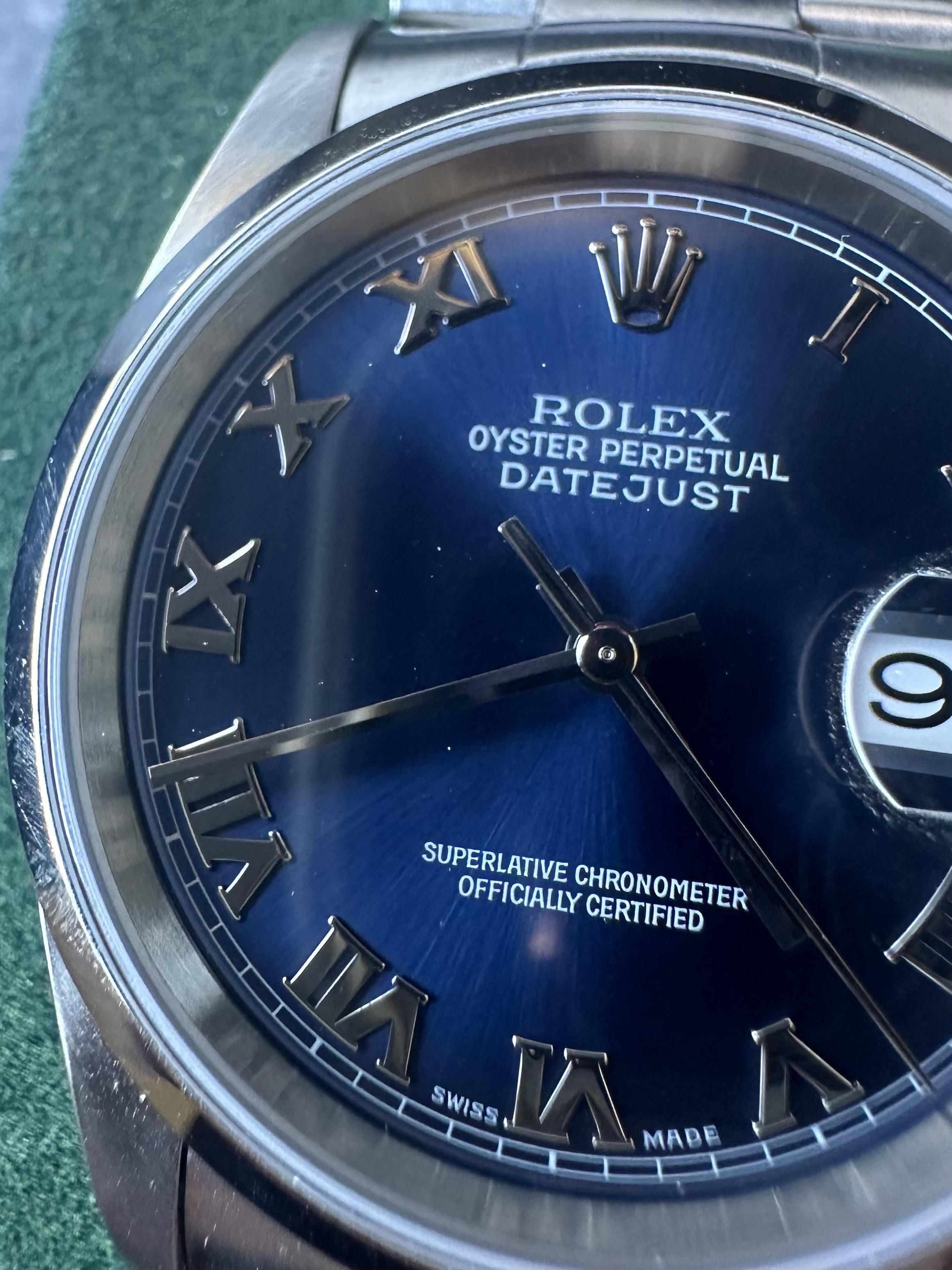 **Rolex Datejust 16200 Blue Dial** Offered here is a very clean Rolex Datejust **16200** featuring a beautiful **blue dial** and **Roman numerals** that really stands out in person. The dial has a classic and understated look, but the blue gives it just enough character to make it more interesting than a standard silver or black configuration. Paired with the smooth bezel + oyster bracelet and timeless Datejust case design, this is an extremely versatile watch that works just as well dressed u...