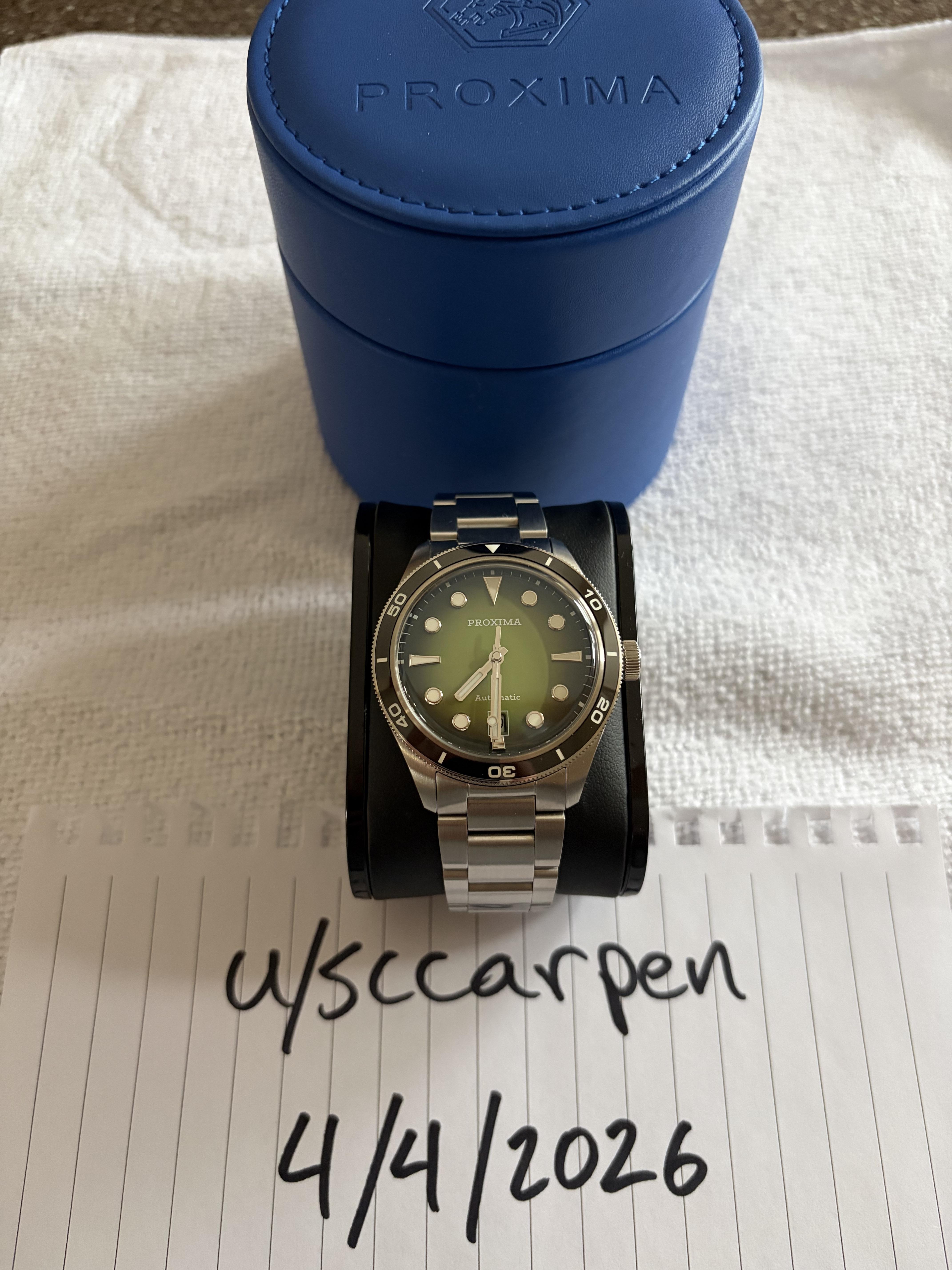 Proxima PX1697 Green dial PT5000 movement 39mm case diameter Micro-adjust clasp All original packaging US seller $150 shipped CONUS, PayPal, Venmo, Zelle https://imgur.com/a/3MjQKMF