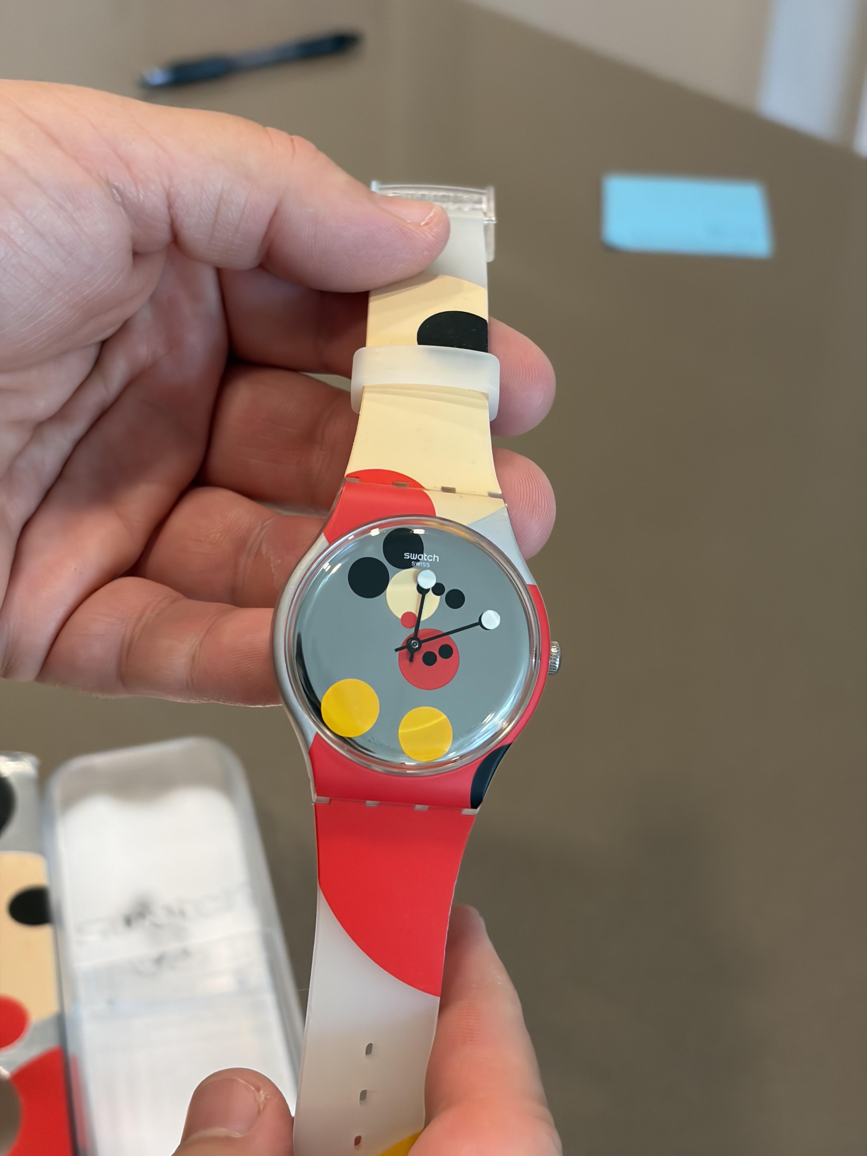 Selling used Swatch Damien Hirst Disney MIRROR SPOT MICKEY Watch. Crystal has some minor scratches, overall watch is in good condition, working great. The storage case has a piece broken off (not the watch itself). See pictures for details of condition. Model SUOZ290S Numbered edition 18522/19999 [timestamp](https://imgur.com/a/Wibyvwo)