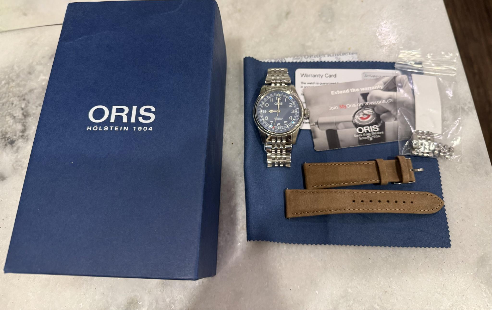 Just acquired this stunning Oris Big Crown Pointer Date 40mm in slate blue and had it professionally sized, only to realize I prefer the 38mm for my wrist size. Hate to let it go but it deserves a wrist it’s perfectly suited for. Condition: Like new. Worn for 1 hour. Simply sized at a local authorized Oris dealer, and realized I’m too close to the line of needing the smaller size. What’s included — complete full kit: • Oris Big Crown Pointer Date 40mm, slate blue dial, coin edge bezel • Stai...