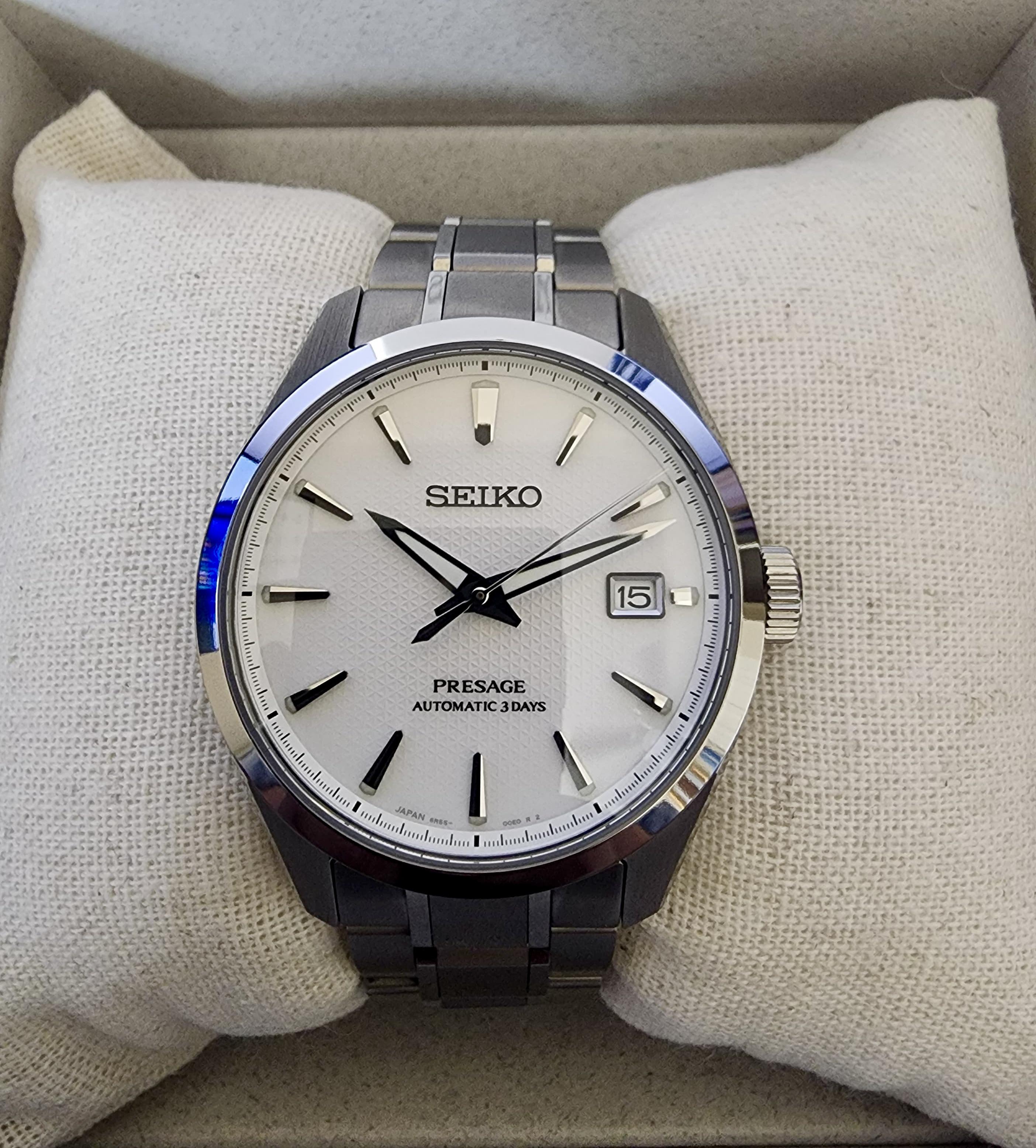 [Photos](https://imgur.com/a/QBCRS0B) [Time stamp](https://imgur.com/a/MxAxnPT) SEIKO SARX115 (JDM) Location: US-Northern VA/DC Details Reference: SARX115 (JDM) Series: Presage Sharp Edged Series Movement: Seiko Caliber 6R55 automatic Power Reserve: 72 hours (3 days) Case: Titanium with Diamond Shield coating Case Size: 40.2 mm diameter × 13.0 mm thickness × 47.4 mm lug-to-lug Crystal: Dual‑curved sapphire with internal anti‑reflective coating Bracelet: Titanium Dial: White Asanoh...