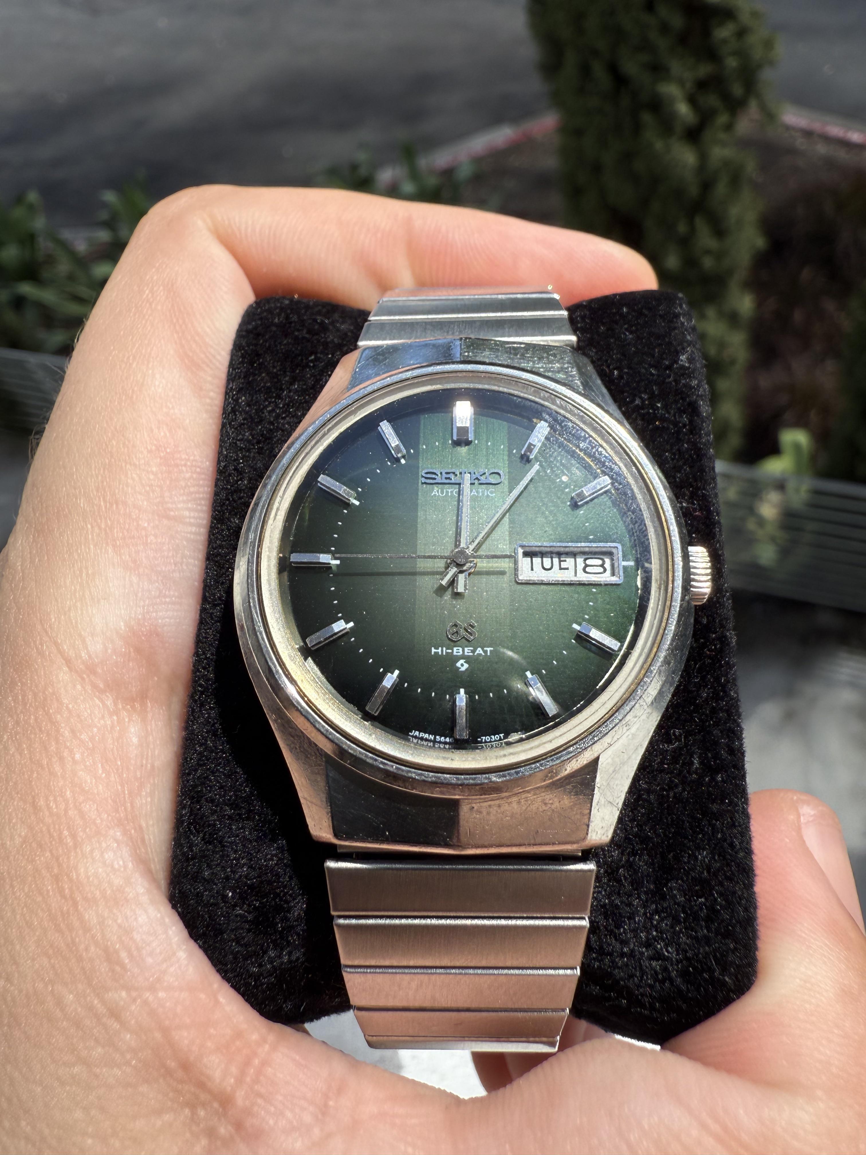 Hello! My first time selling on r/watchexchange, I hope y’all will beat with me. I have a rare vintage Grand Seiko piece, ref 5646-7020 Hi Beat. Green dial, non original flexi-bracelet. Watch is in solid shape due to its age. Case has very light scratches throughout with a deeper hairline scratch located on the bottom left of the case near the 7 o clock position. It is highlighted in one of the photos. The dial has some wear due to age around the edges at the 1 o clock, 3 o clock, and 5 o cl...