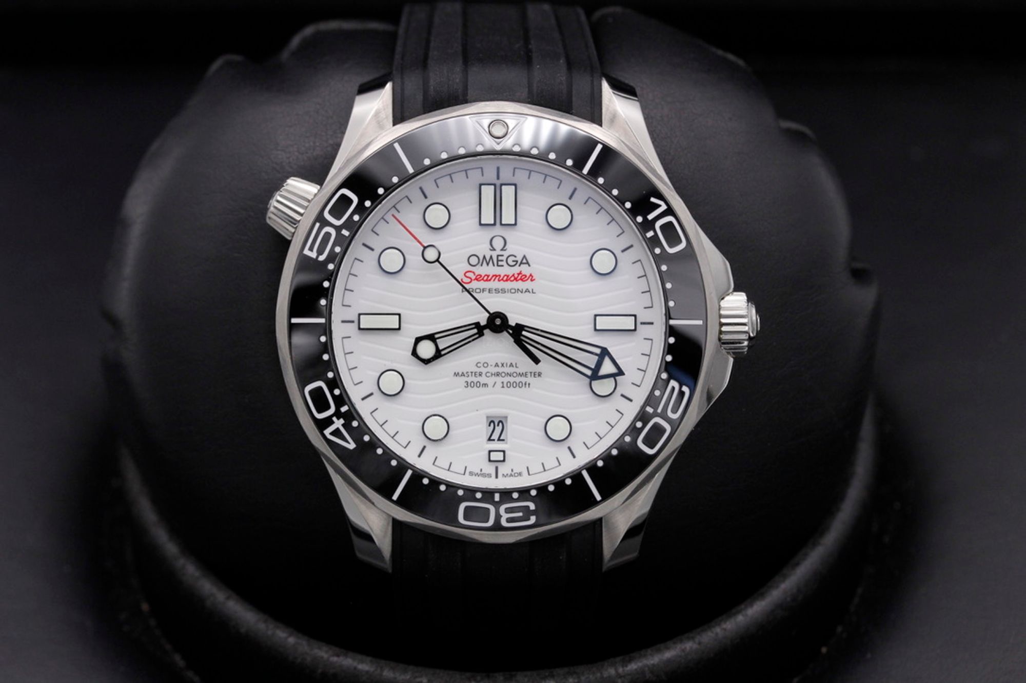 Hello All, Omega Seamaster 300M 210.32.42.20.04.001 Brand: OmegaModel: Seamaster 300MCase Size: 41mmCondition: Pre-OwnedGrade: MintBracelet Type: RubberMaterial: Stainless SteelDial: White WaveAge: ModernMovement: AutomaticPapers: YesBox:...