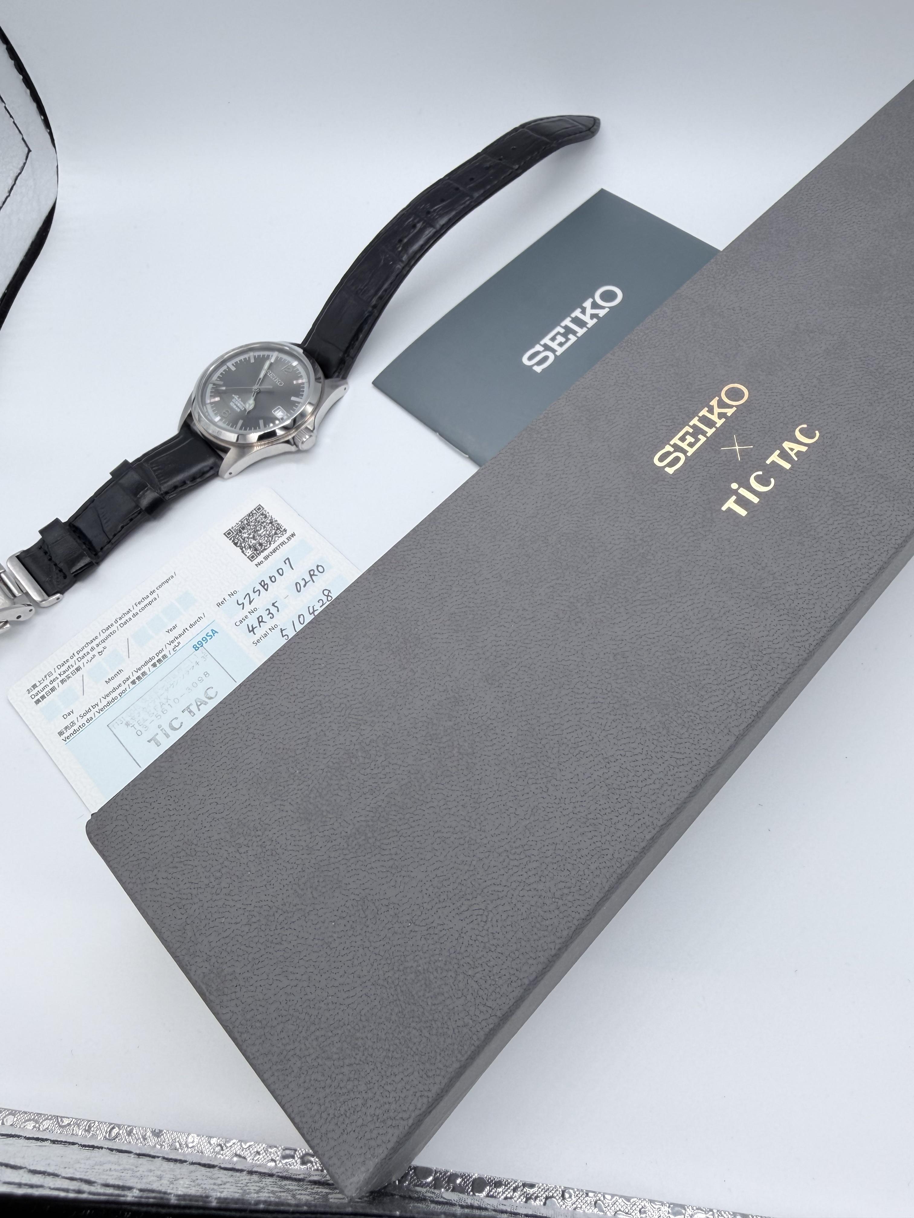 Hello, I’m offering the SEIKO x TiCTAC SZSB007, a limited edition collaboration model celebrating the 35th anniversary between Seiko and TiCTAC. This version features a very attractive grey dial that truly stands out. Overall condition remains excellent. It is a JDM exclusive and comes as a full kit still under Seiko warranty Specifications: Movement: Automatic Seiko 4R35 (hand-winding and hacking) Power Reserve: Approximately 41 hours. Case: Stainless steel – 40mm diameter, 11mm thickness...