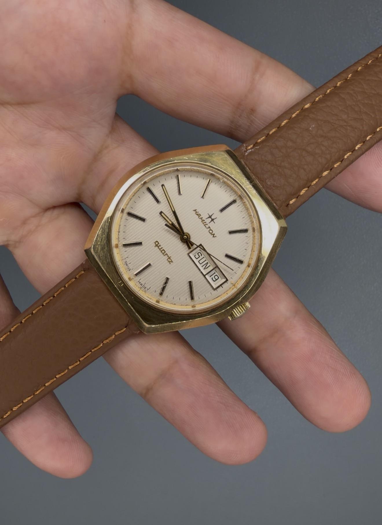Vintage Men’s Hamilton 709006 -Details: A beautiful vintage men’s Hamilton 709006 in gold tone with a brown leather strap. Has a quartz movement with a day and date function, acrylic crystal, service caseback, and is watch only. This piece has a unique gold tone hexagonal case, truly a nice piece from the 70’s! The crystal has a barely noticeable scratch, but is in overall good condition. See the photos for yourself! -$247 shipped -Includes shipping (US). I accept Venmo, Zelle, CashApp, and ...