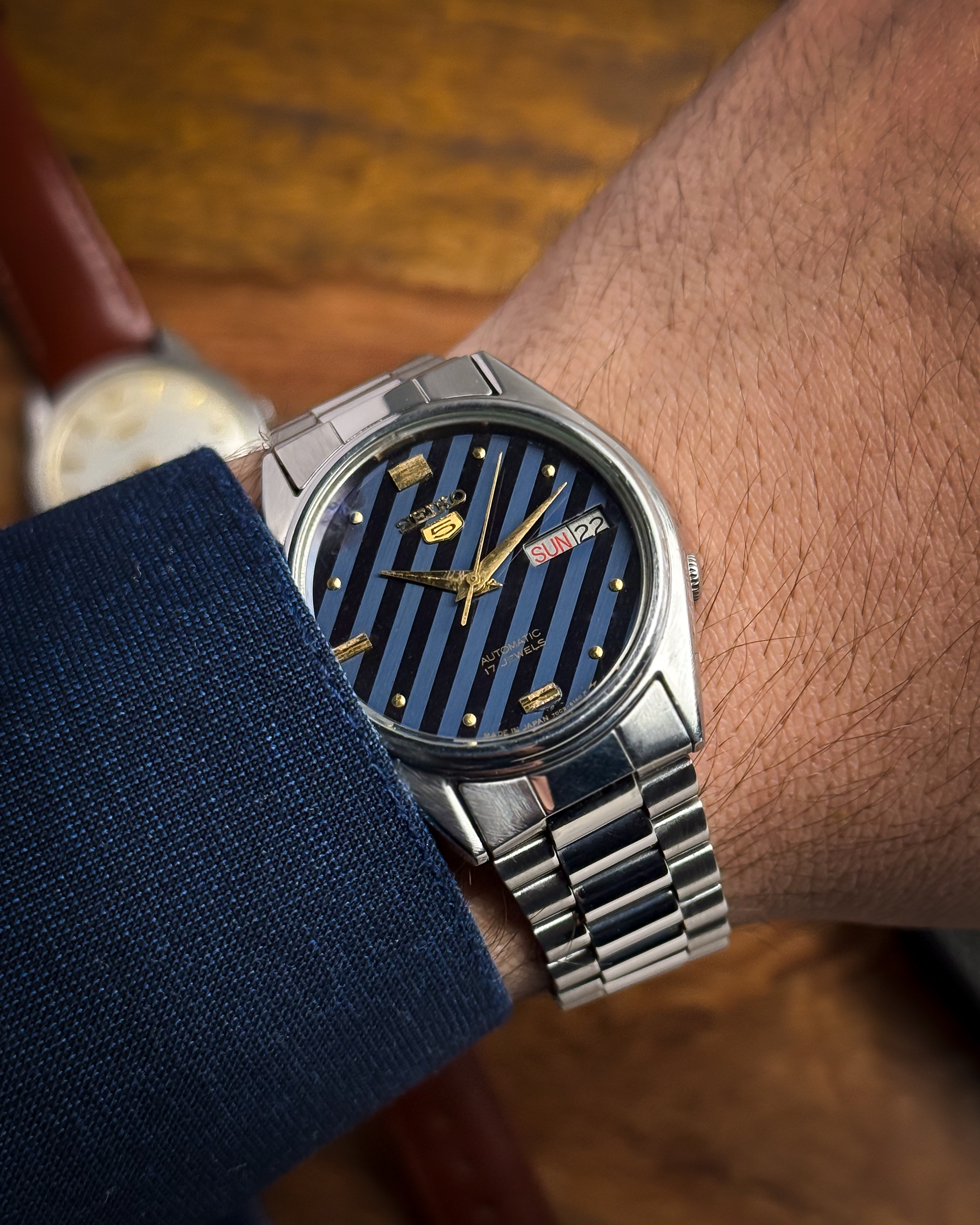 [Timestamp](https://drive.google.com/file/d/1CiSgokXRm8WV1dKoerT1yZZhi_OFW_2l/view?usp=sharing) Up for sale is a truly uniqueย **Seiko 5 from December 1991**. While many Seiko 5s of this era went for conservative sunbursts, this Ref. 7009-6240 features a rareย **Candy Stripe Brushed Dial**. The alternating vertical blue and light blue stripes create a metallic, shifting texture that is incredibly eye-catching and full of retro charm. The dial layout is perfectly balanced, featuringย **dotted ...
