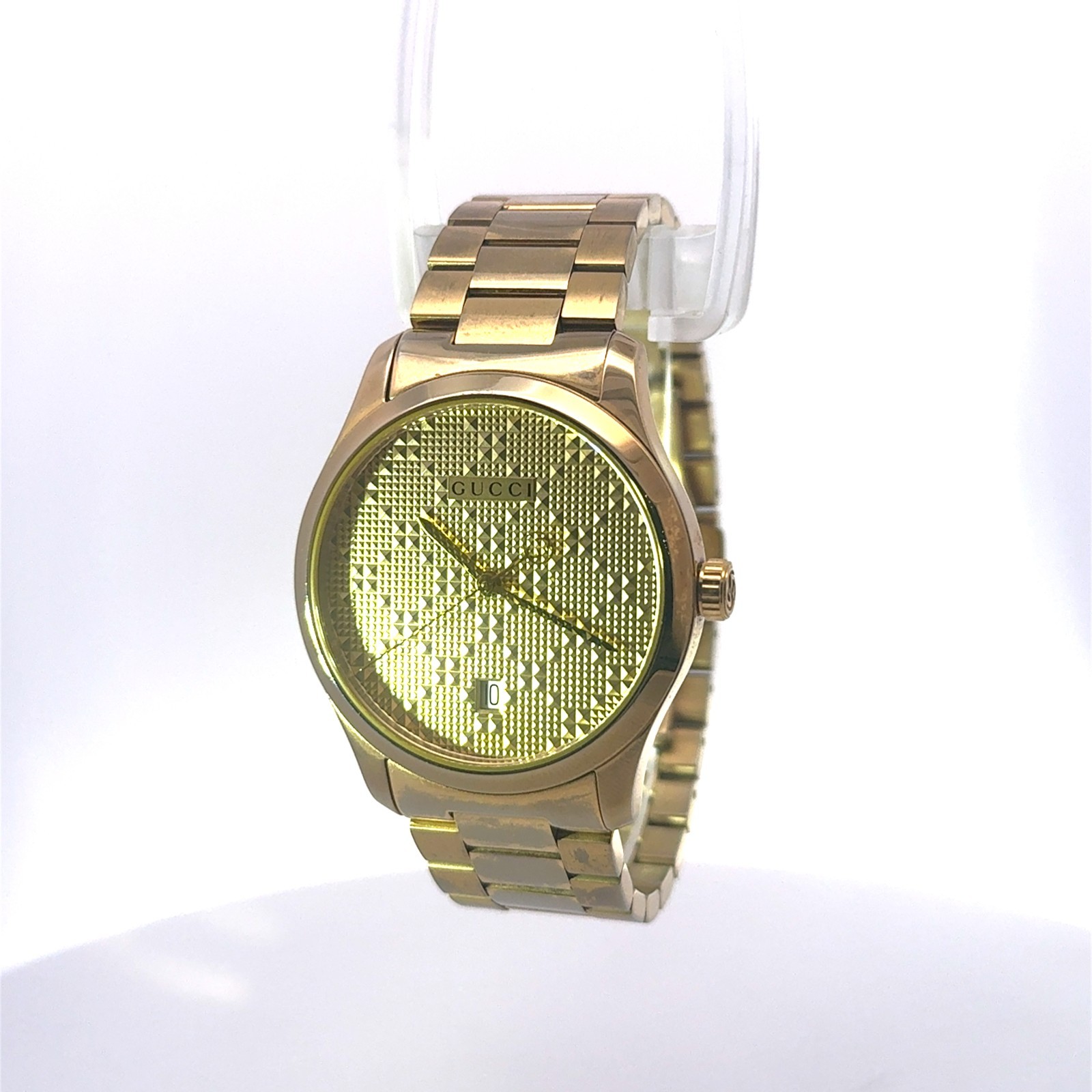 Gucci G-Timeless 126.4 Gents Swiss Watch Geometric Dial Gold Dial w/ Date 38mm