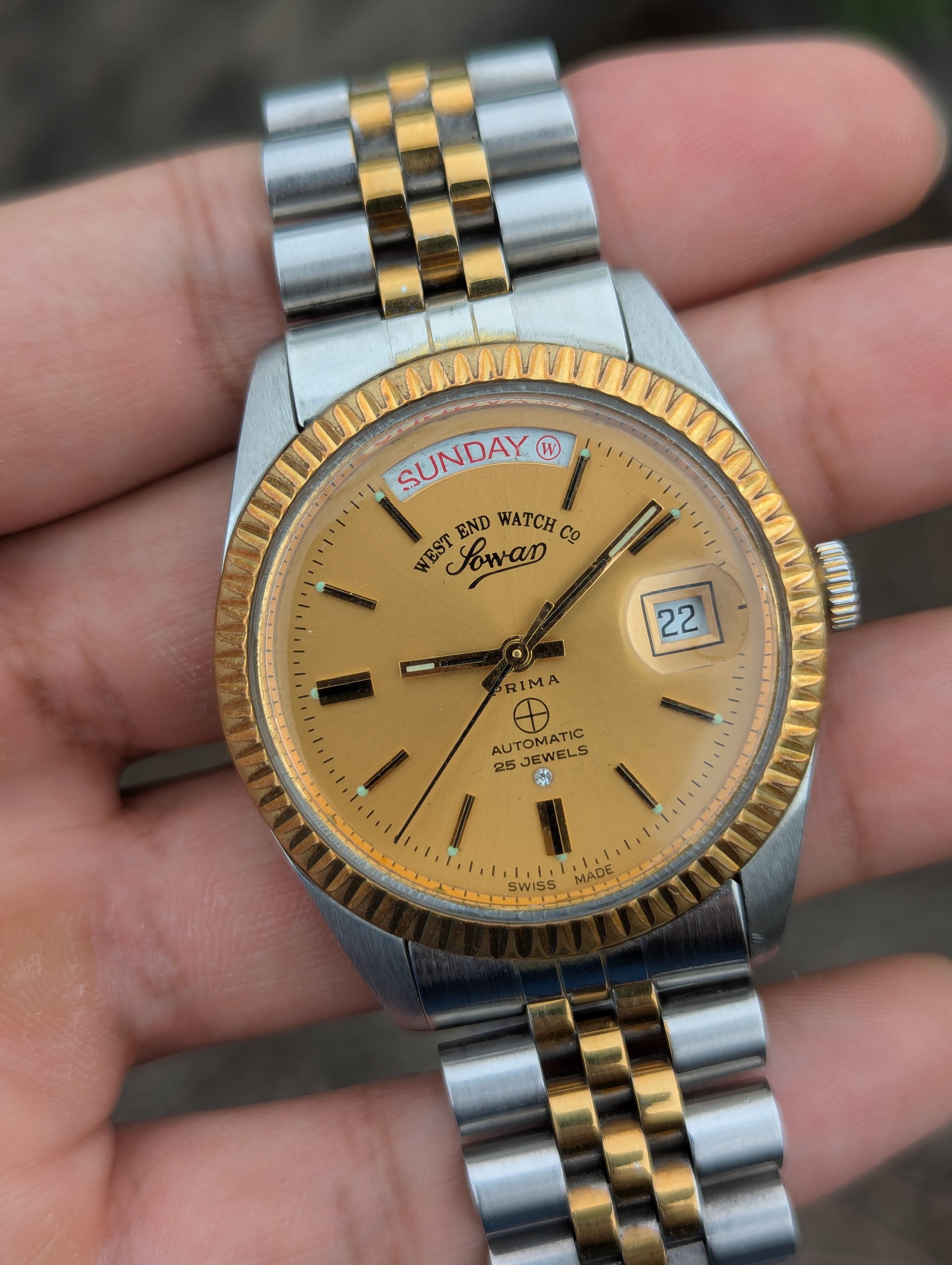 [WTS] Vintage West End Watch Co - President Day/Date – Two tone - Flutted Bezel - 25J Automatic - 1980’s Swiss --- 339 USD Only Vintage West End Watch Co - President Day/Date – Two tone - Flutted Bezel - 25J Automatic - 1980’s Swiss Presenting the WEST END WATCH CO. SOWAR PRIMA PRESIDENT, a timeless gem from the 1980s. This vintage wristwatch boasts a luxurious gold-tone dial that perfectly complements its silver and gold mix case. With stick-style hands and indices, time-telling becomes a br...