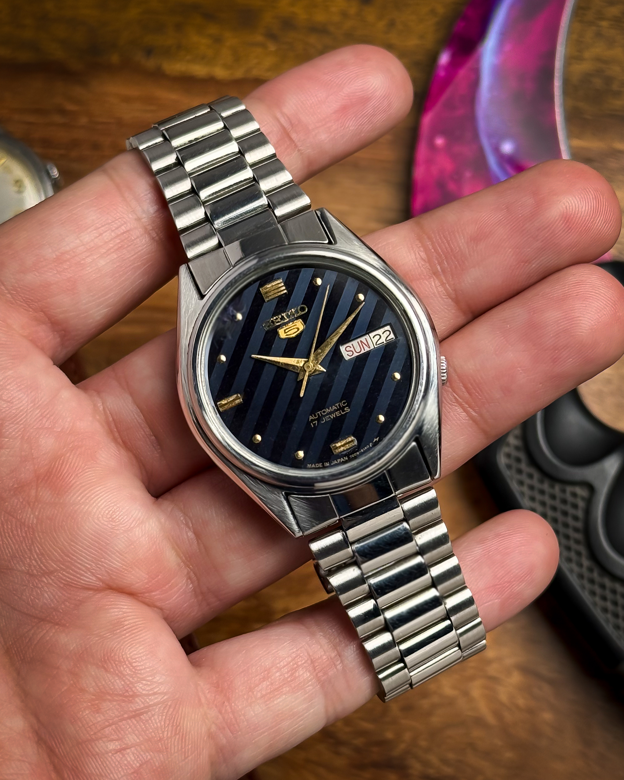 [Timestamp](https://drive.google.com/file/d/1QFRQLQFOUdThT0Bn1eroji5jABCq4TaH/view?usp=sharing) Up for sale is a truly uniqueย **Seiko 5 from December 1991**. While many Seiko 5s of this era went for conservative sunbursts, this Ref. 7009-6240 features a rareย **Candy Stripe Brushed Dial**. The alternating vertical blue and light blue stripes create a metallic, shifting texture that is incredibly eye-catching and full of retro charm. The dial layout is perfectly balanced, featuringย **dotted ...