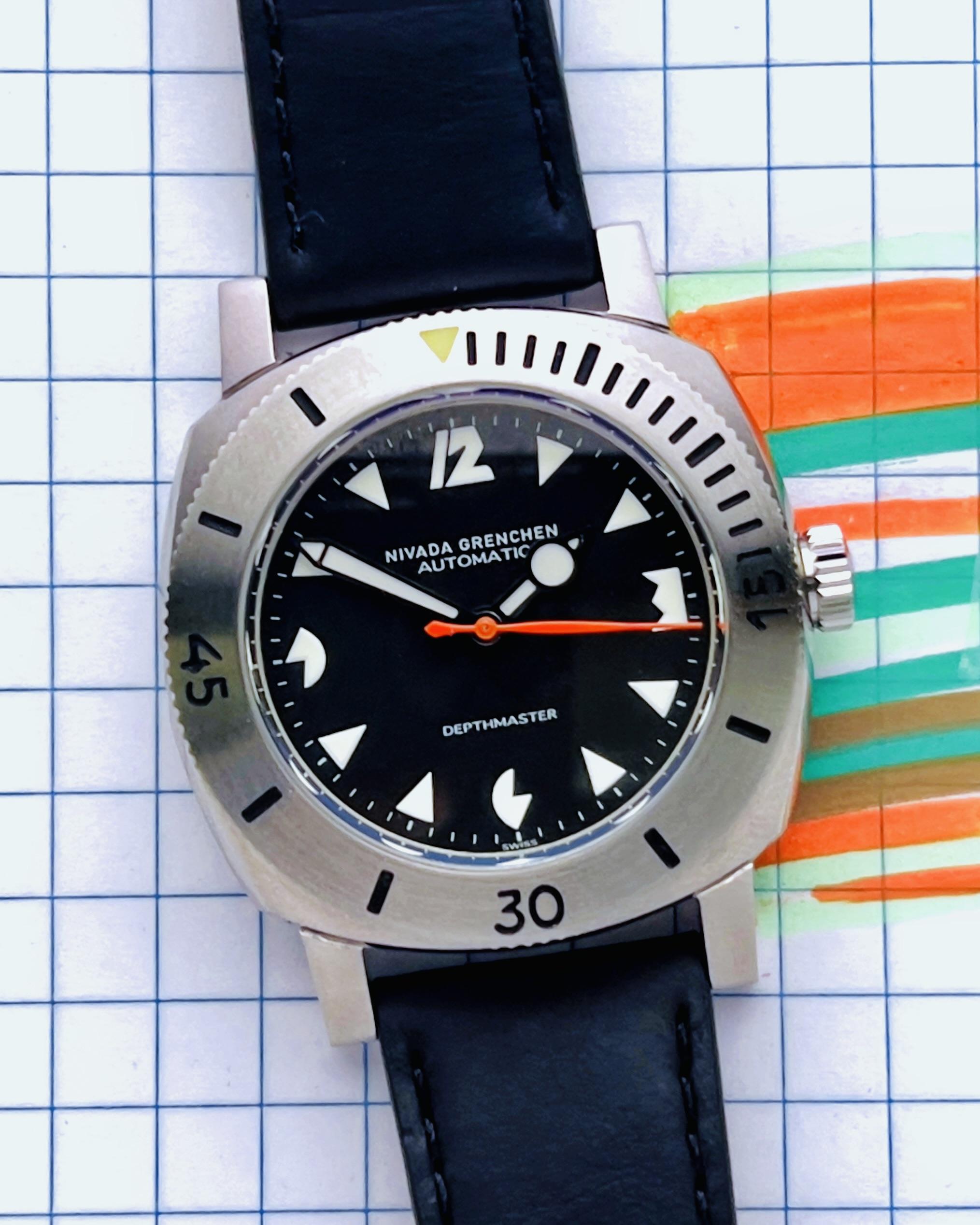 Nivada Grenchen ART DECO DEPTHMASTER - 39MM Pacman Nivada Grenchen makes vintage inspired timepieces and proportions with the addition of modern tech. This funky Depthmaster is a modern reissue of Nivada Grenchen's iconic 1960s dive watch in stainless steel cushion case and referred to by collectors as the "Pac-Man"due to its distinctive Art Deco hour markers. Overall, this one is in excellent shape—no notes _________________________________________________ Specifications: Diameter 39mmLu...