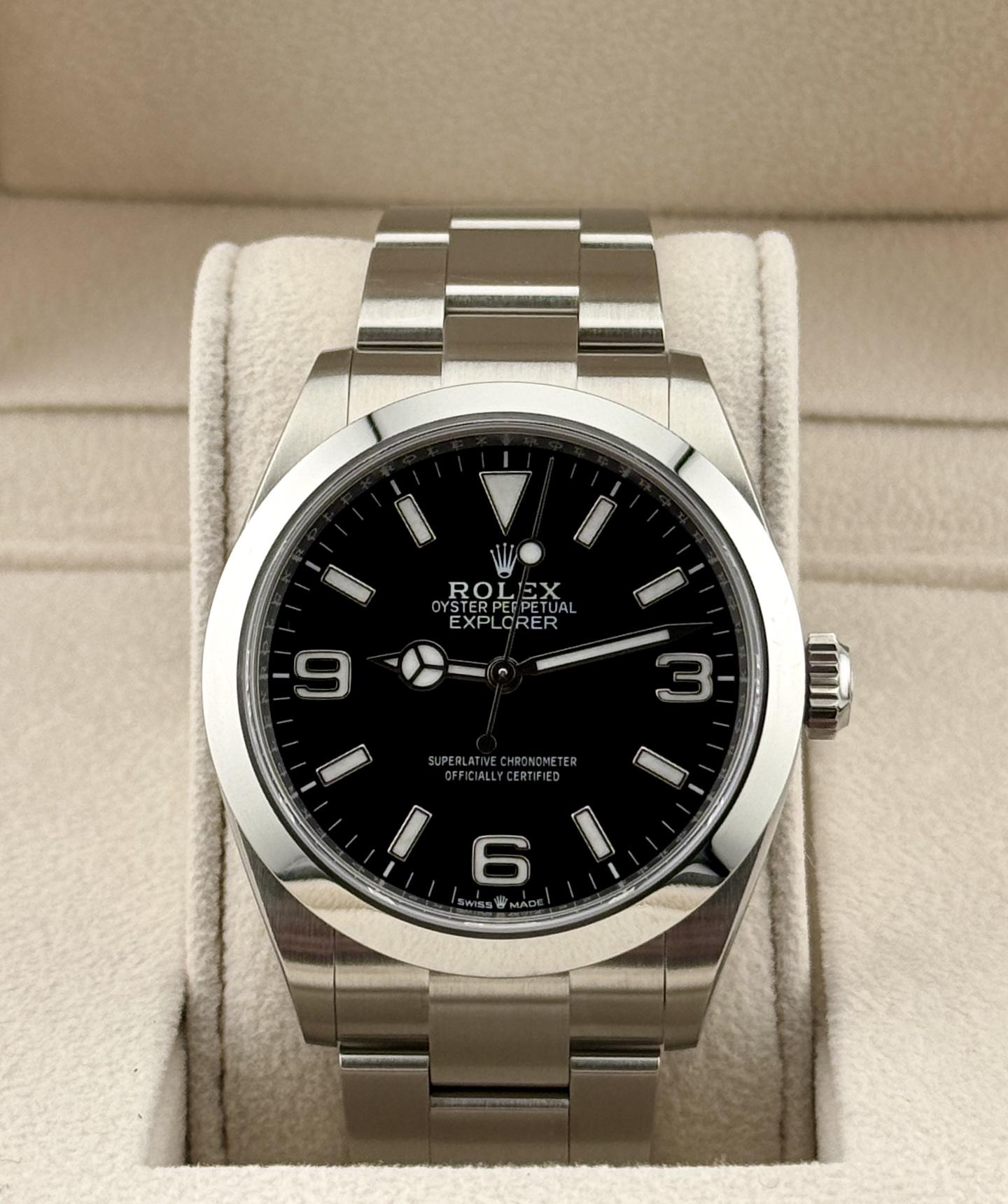 Rolex Explorer Reference: 224270 Case Size: 40mm Case Material: Stainless Steel Bracelet Material: Stainless Steel Crystal: Sapphire Movement: Automatic Calibre 3230 Box/Papers: Yes Age: Warranty Card Dated October 2023 This Rolex Explorer is in very good condition. It is the newest reference featuring the iconic 3, 6, and 9 dial on a steel bracelet. It comes with boxes, booklets, and warranty card dated 10/29/2023. The case is in very good condition with a few light marks. The bracel...