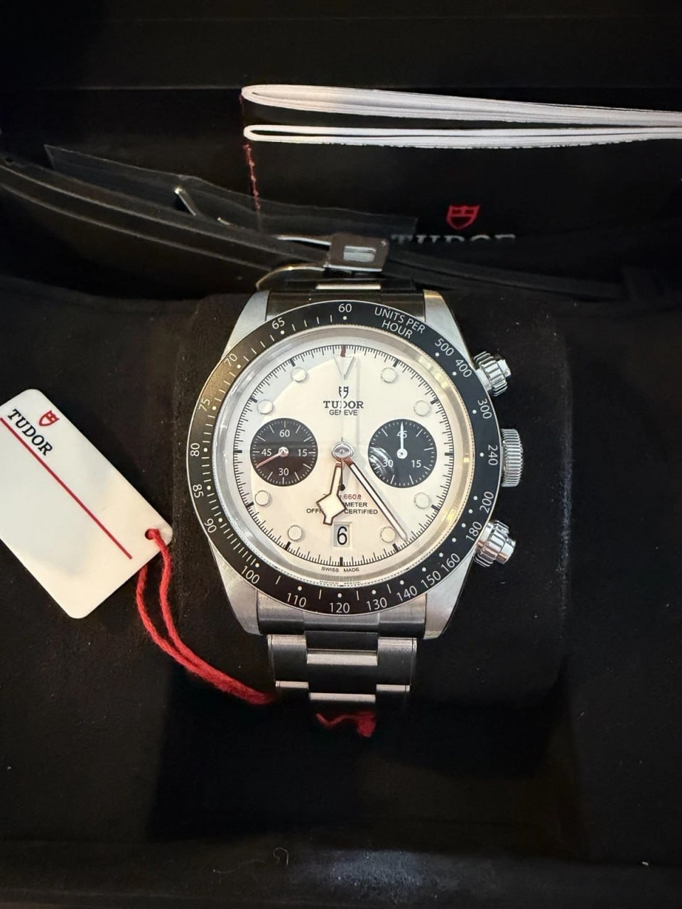Selling my Tudor Black Bay Chrono M79360N (Panda Dial) This one is from 2023. Excellent condition with some minor signs of wear on the clasp and polished sides, consistent with careful use. Comes as a full set with the original steel bracelet, all links included. Also includes the inner and outer boxes, manuals, and warranty card dated 2023. Price: $2900 plus worldwide shipping. Payment accepted: Wire transfer only.