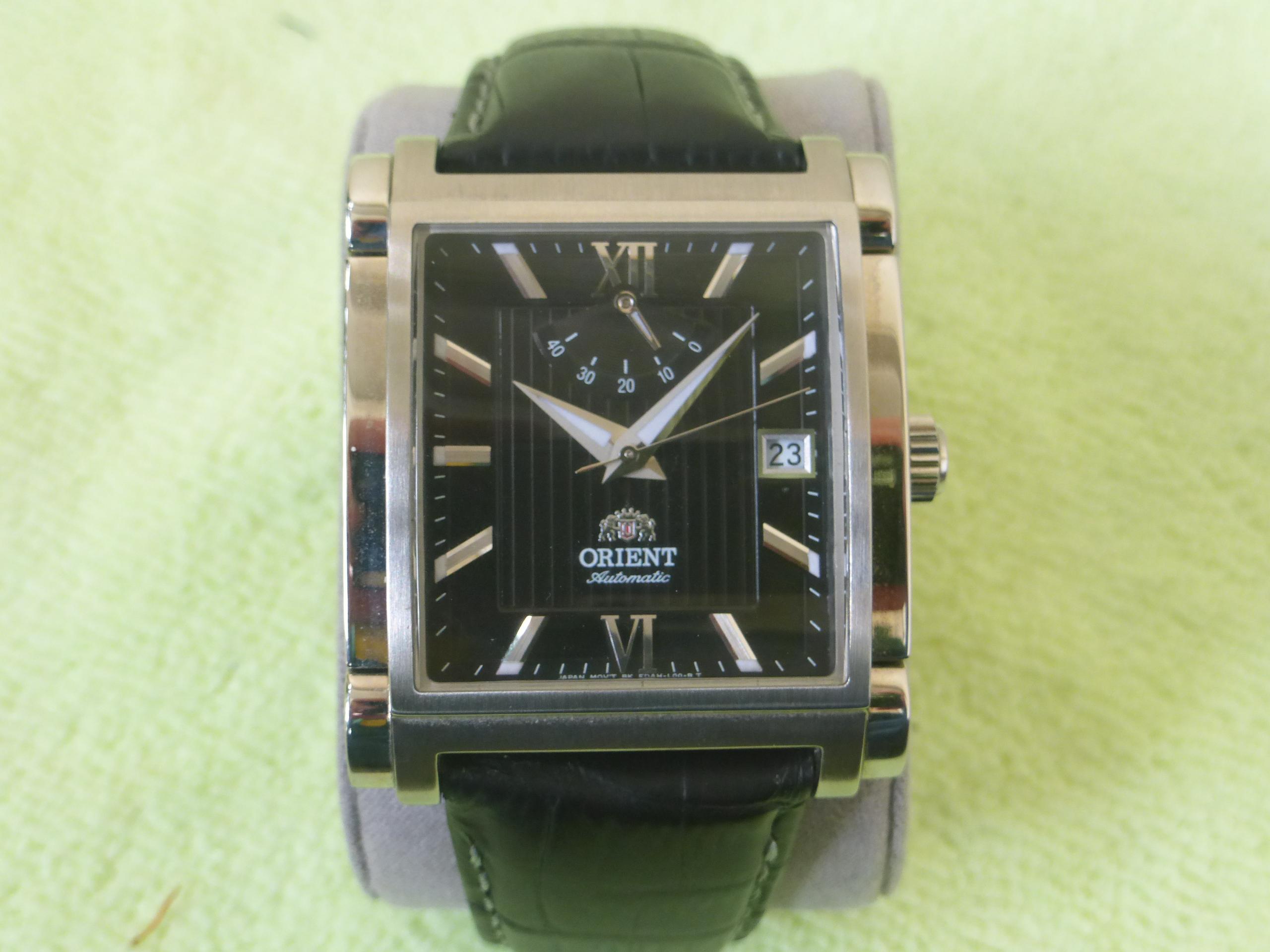 For sale is an excellent condition Orient men’s tank watch with power reserve. Black dial with silver markers. Date window at 3. Model number FDAH-CO-A. Comes on Orient leather strap with deployant clasp. Works fine, keeps good time. Measures 36mm wide excluding the crown (9 to 3) and 38mm tall (12 to 6). No box or papers. Asking $165 shipped in the continental US, sorry no trades.