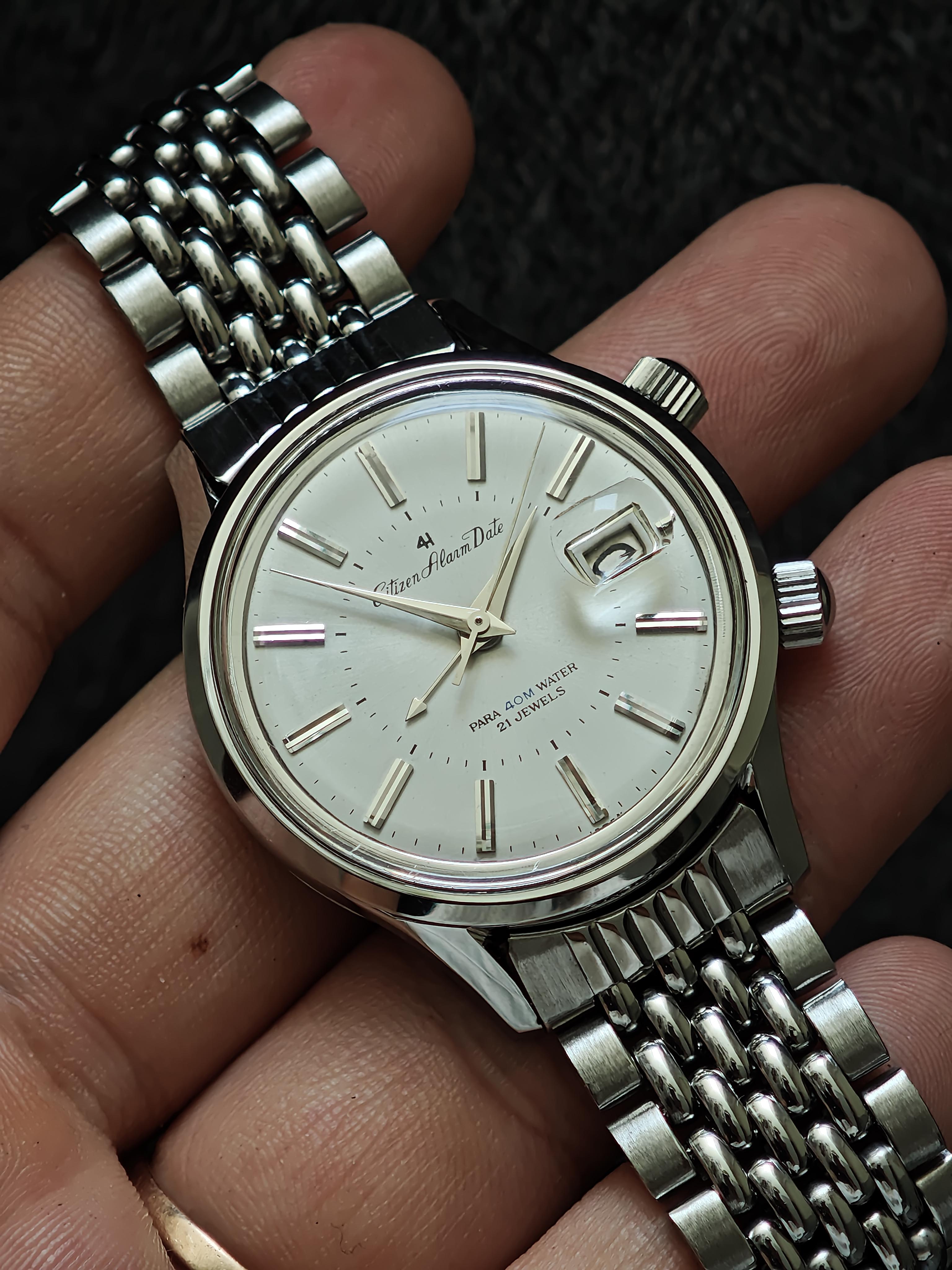 Up for sale is a very clean Citizen Alarm Date — one of those pieces that really makes you stop and rethink the brand. Simple on paper, but a lot of charm in person. This example is all original, paired with the full bracelet which is getting harder to find. The dial is super clean, nice balance overall… nothing feels off. Condition:Serviced, keeping good time. Case has been Sallaz polished — clean look while still holding its shape well, LOUD ALARM!!! Specs:• Case: 37.6 x 45.3 mm (wears clos...
