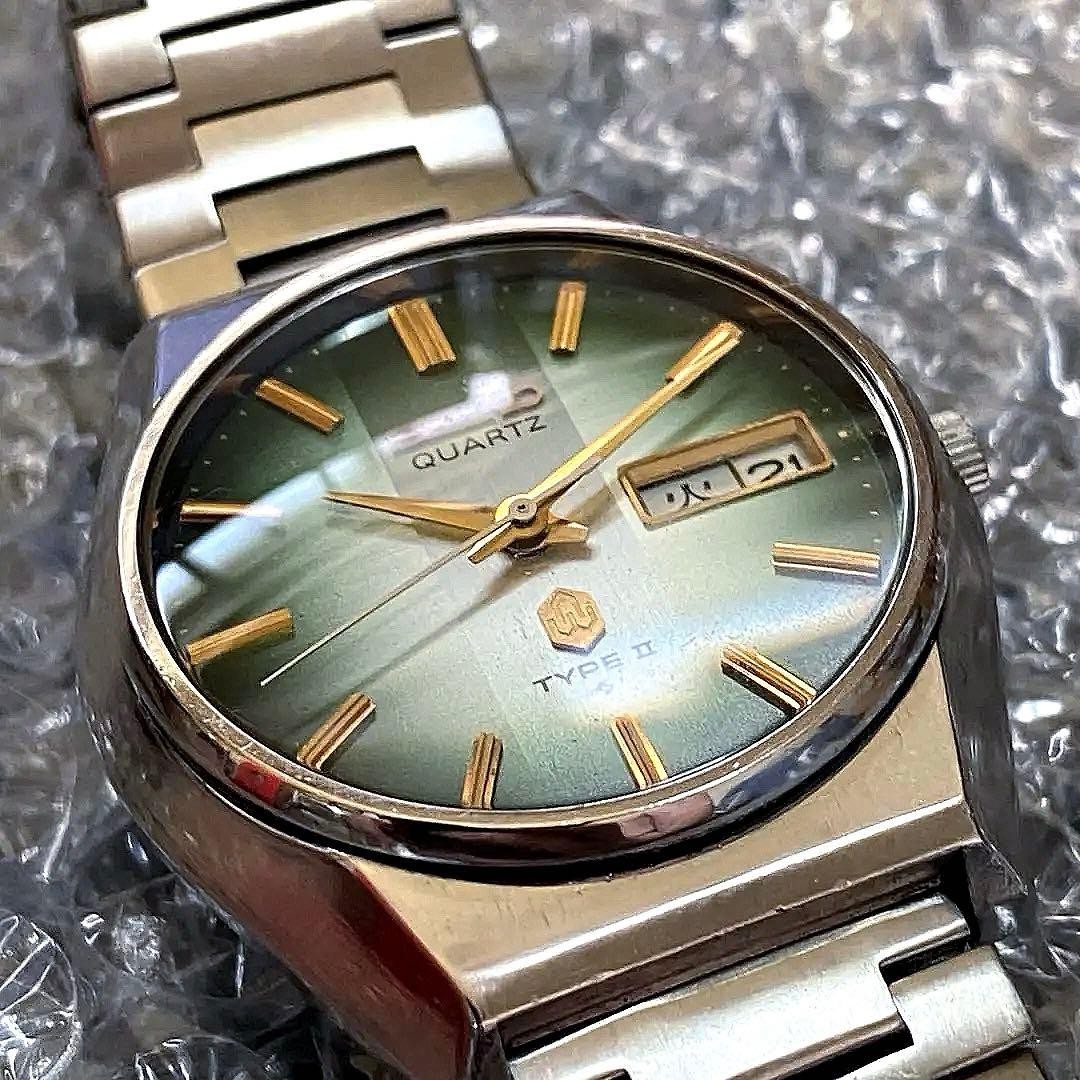 SEIKO Quartz TypeII 1976 Watch Vintage Green Dial Day Date 37mm Case