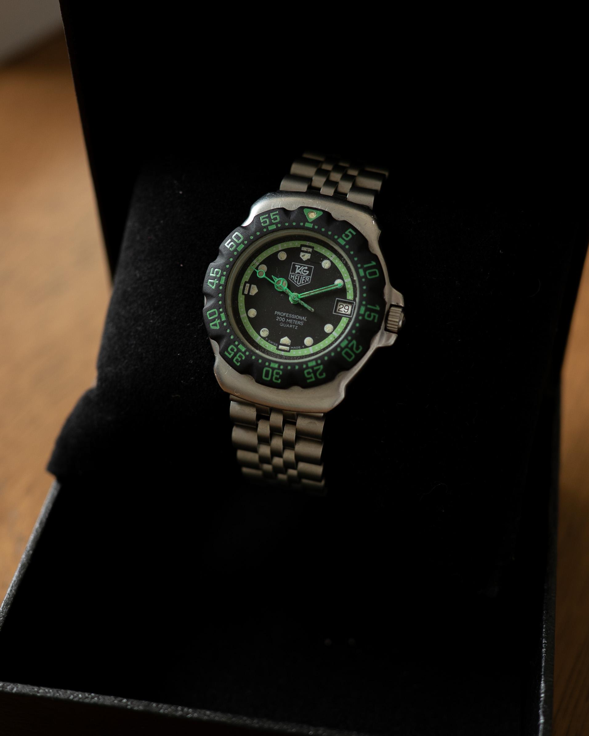 Hello WatchEx! Up for sale is this Tag Heuer F1 Professional Quartz in this rare black and green colorway. With the recent release of the Kith x Tag Heuer F1 collab, the original F1 watch has regained its popularity. But with a $1500 price tag and case made out of plastic, the Kith Heuer F1 just doesnโt make much sense. If youโre looking to rock the same look but with a watch thatโs more durable with a stainless steel case and proper movement, consider the original Tag Heuer F1 from the 90s...