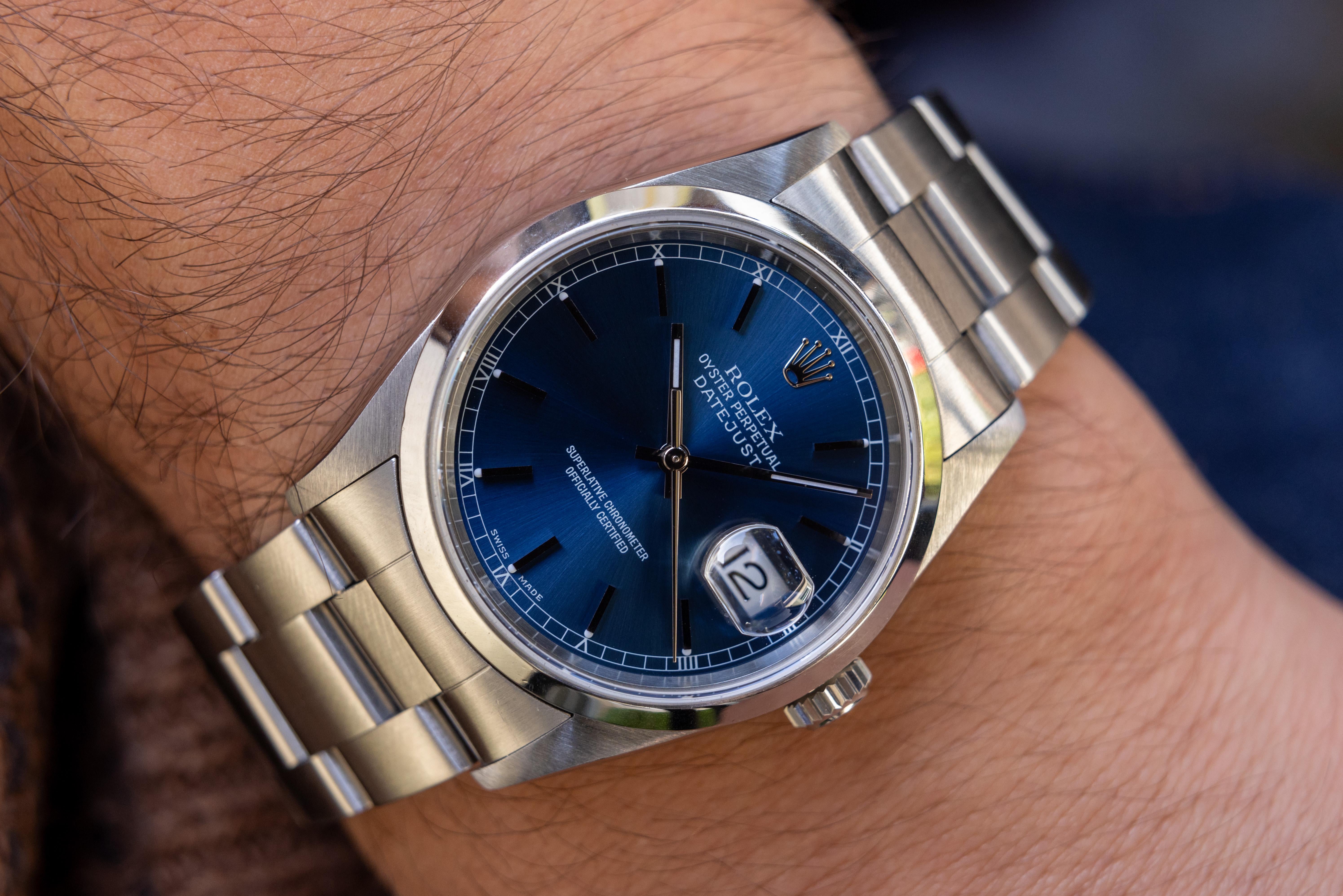 [pics](https://imgur.com/a/A5ydMVS) [timestamp](https://imgur.com/EoLec0U) Case: Excellent condition 36mm no-holes case with thick and even lugs. The stainless steel smooth bezel is crisp and remains sharp. Overall very light signs of use. Y-serial. Dial: Excellent condition blue dial with matching hands. Bracelet: The 12 link oyster bracelet is in excellent condition and remains tight. The clasp has an AD code dating it to 2003. Accessories: None. Watch only. Notes: A stunning sunburst bl...