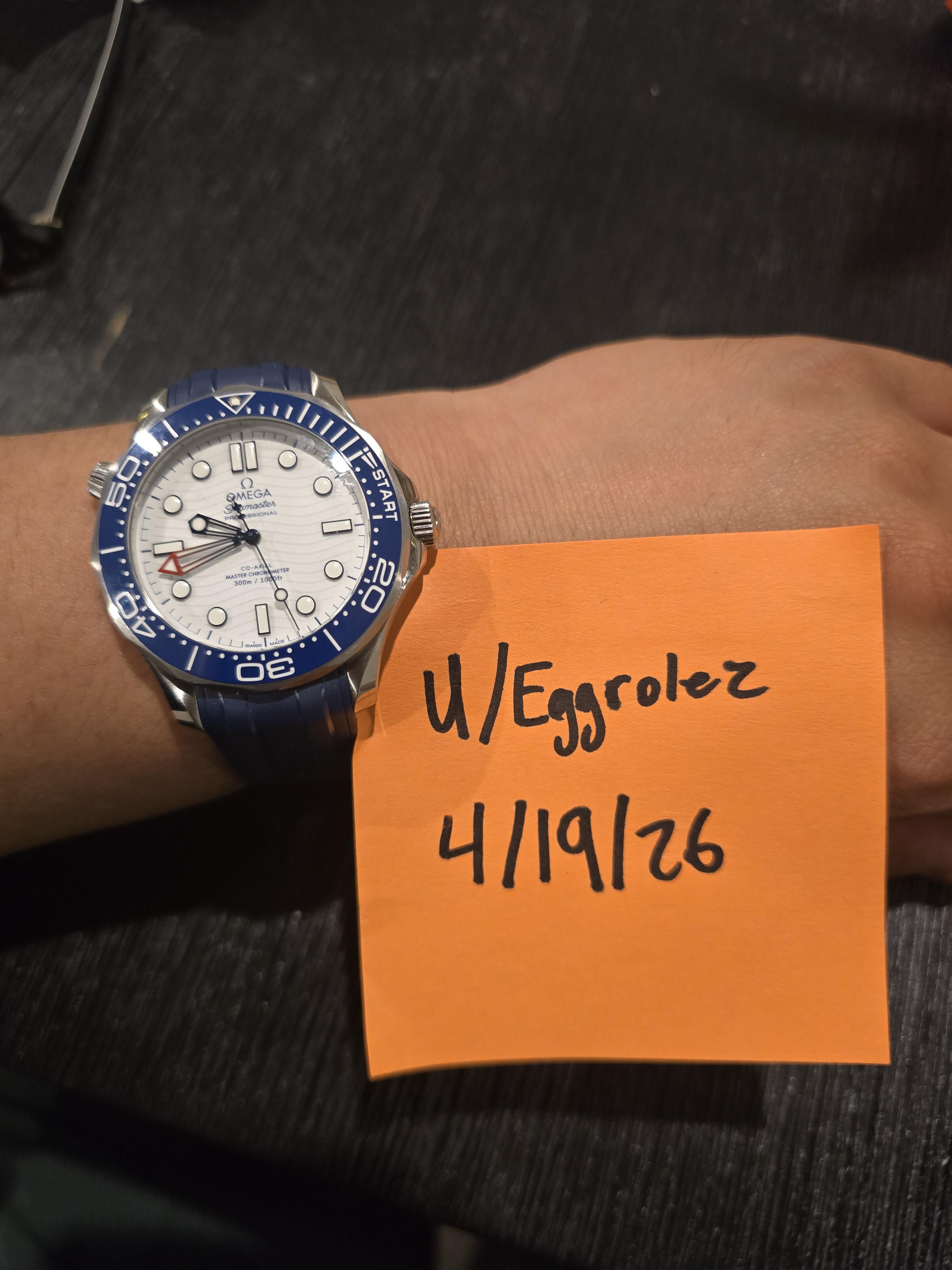 2025 Omega Seamaster Diver 300M "America's Cup" Edition - Full Kit - $4.8k Built to celebrate the 37th America's Cup in Barcelona, Omega took the classic white-dial Seamaster and gave it an incredible nautical twist. The dial is a matte white ceramic with laser-engraved waves standing out in positive relief. Surrounding it is a blue ceramic bezel featuring a unique regatta starting scale. But the best part? It is powered by the Master Chronometer Calibre 8806, meaning there is no date window....