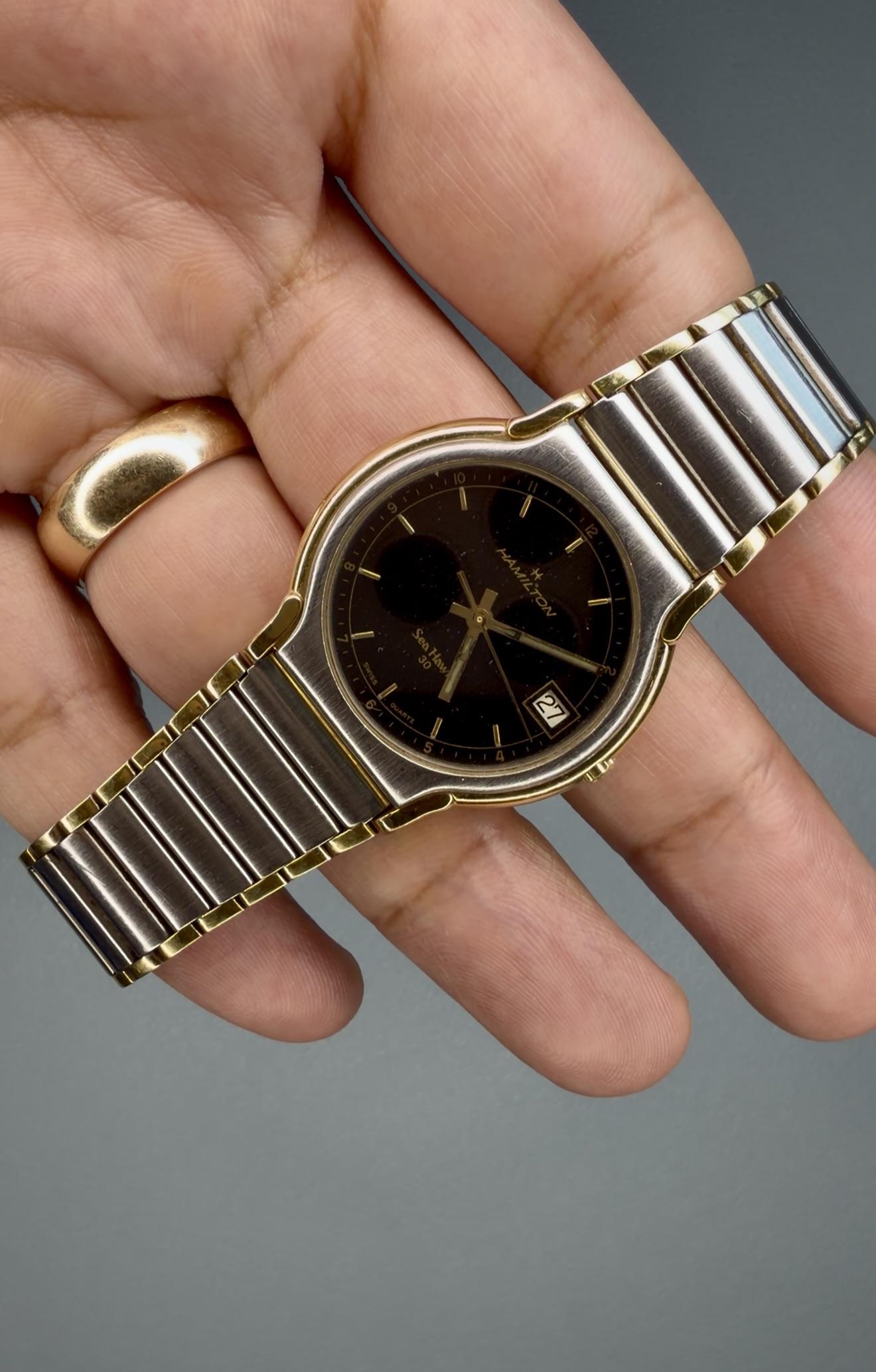 Vintage Mens Hamilton Sea Hawk 30 -Details: A beautiful rare vintage men’s Hamilton Sea Hawk 30 with an S&G case, integrated bracelet, and black dial. Uses a butterfly clasp, watch only. In good condition, see the photos for yourself! -$227 shipped -Includes shipping (US). I accept Venmo, Zelle, CashApp, and PayPal (+4% if using G&S) -Case size: 31mm w/ crown -Movement: Quartz -Max wrist size: 7.25 -Timestamp: https://imgur.com/a/MjOdlOh -Location: Downtown Los Angeles -IG: @ColeccionD...