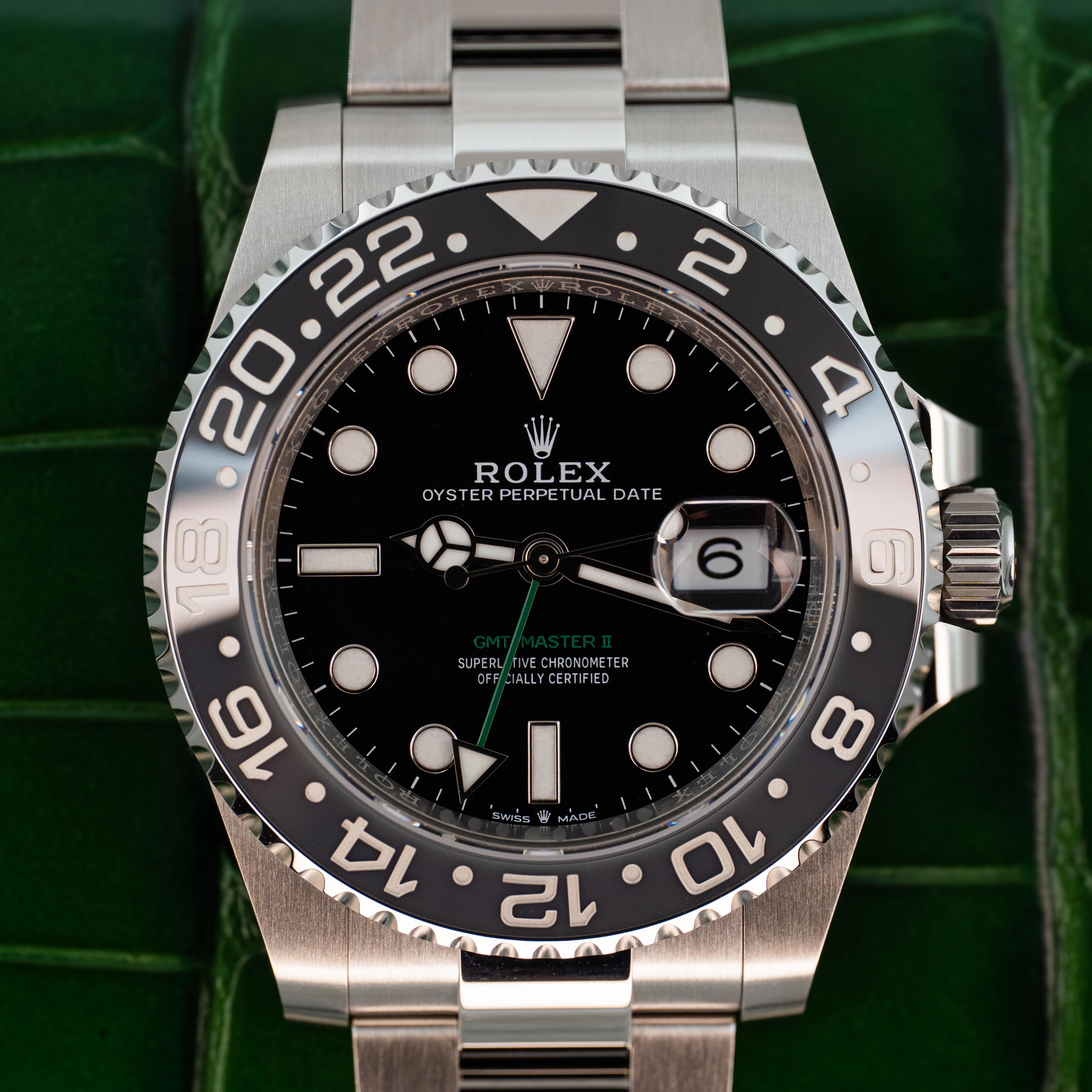 April 2026 Rolex GMT Master II Bruce Wayne 126710GRNR Oyster 40 B+P w White Tag Price: 20,300 The Rolex GMT-Master II 126710GRNR “Bruce Wayne” is one of the newest and most talked-about models in the GMT Master II lineup, featuring a black and grey bezel paired with a clean, versatile look on the Oyster bracelet. The GMT function makes it useful for travel, while the overall design keeps things sharp without being too flashy. It’s an excellent example that lives up to the name because...