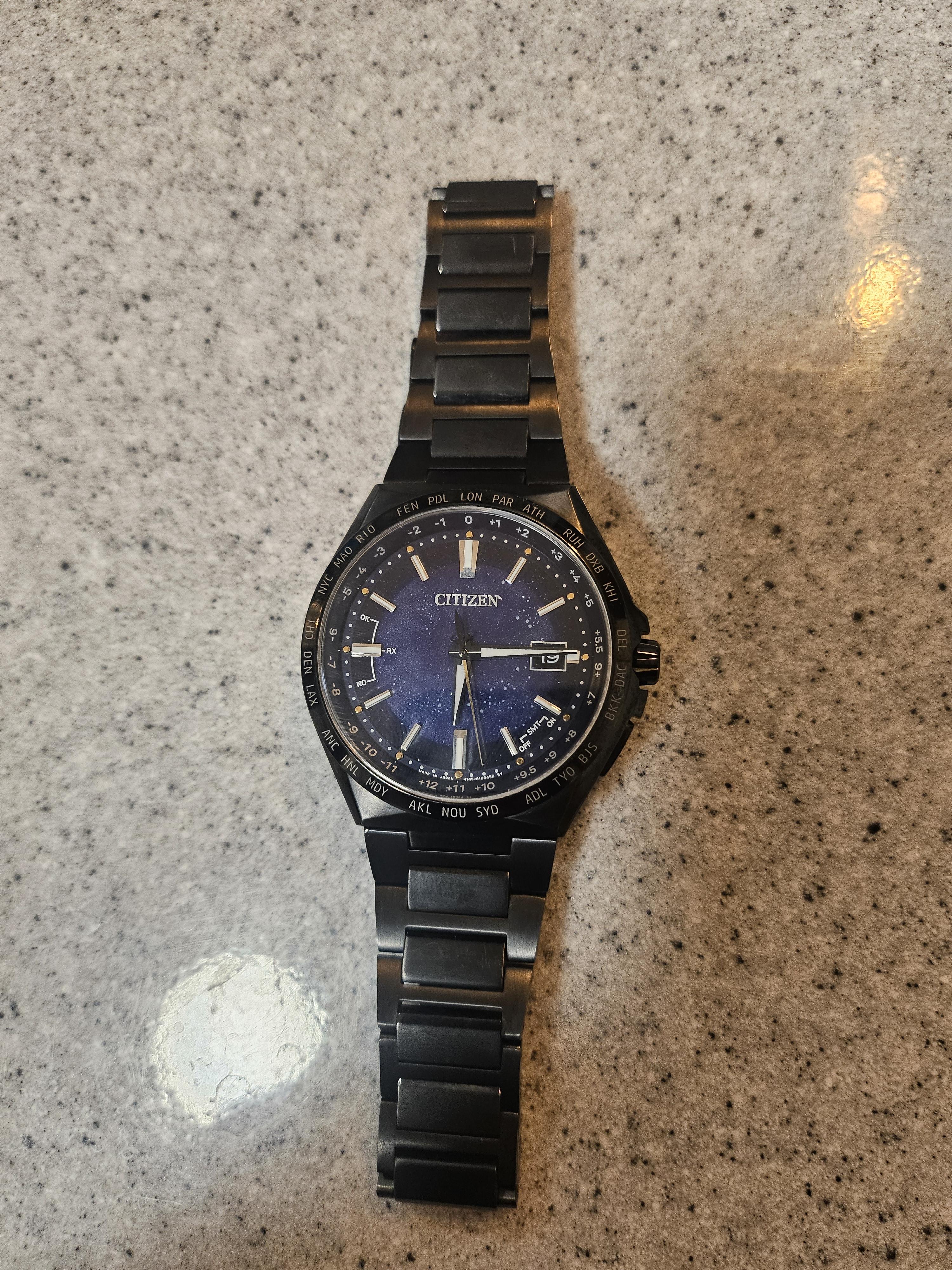 My full titanium citizen attesa. Gets radio signal every night like clock work pun intended. Has some scuffs on the bracelet. It being titanium it can happen easily. But still a awesome limited piece from citizen with the blue fume adventure dial with gold accents. Price is 600 shipped usa Willing to trade in the 6-800 range.