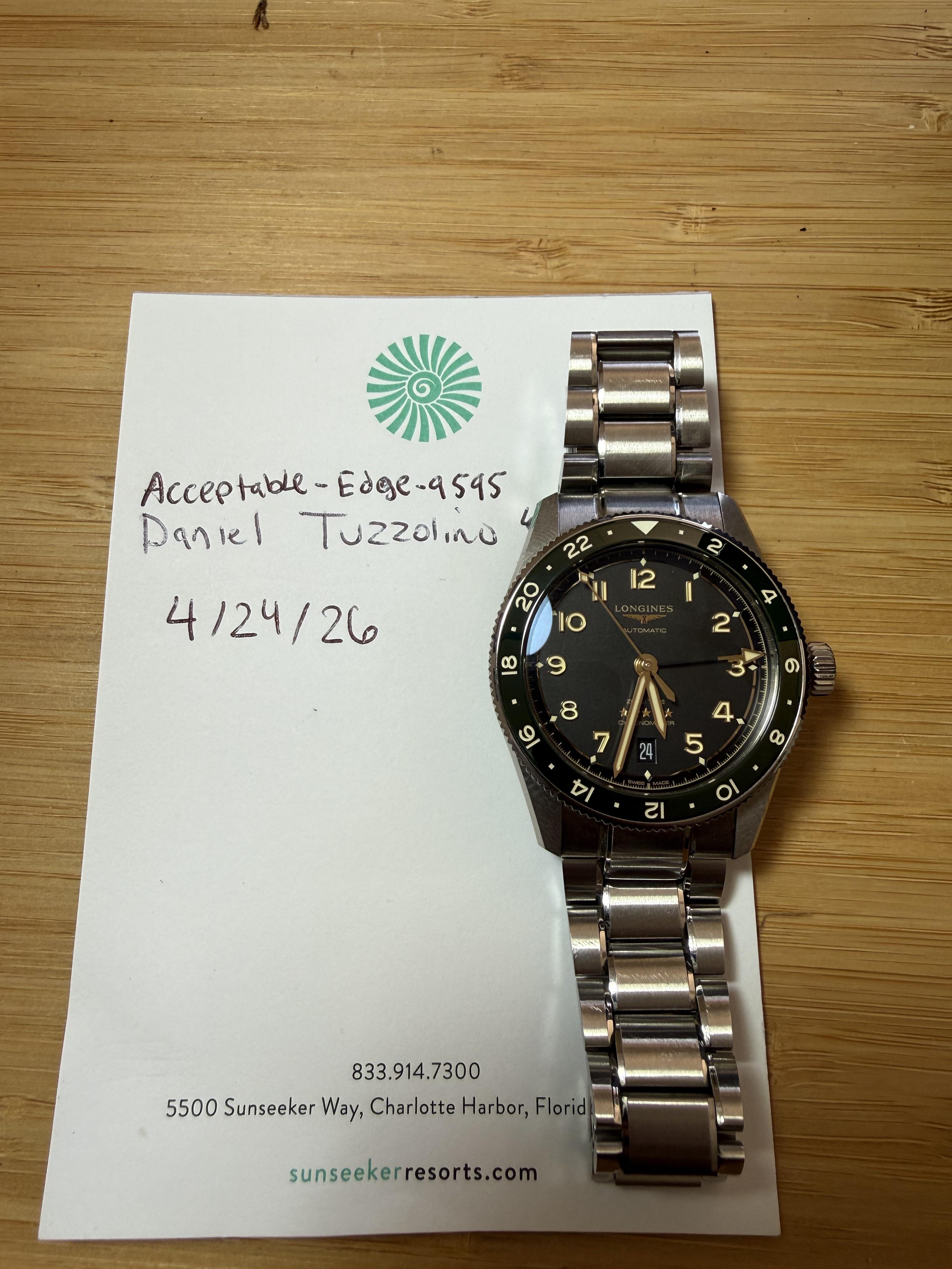 Longines Zulu Time Green Bezel Reference Number: L38024636 Year: 2025 Case size: 39mm Automatic Swiss Made Sapphire Crystal 9.5/10 Watch is in very good condition with only some slight scuffing on the bracelet and clasp Guaranteed original Watch comes as a full set with box and papers, and includes an additional rubber strap. Available now. For further details or to get a FaceTime of the watch, please contact me. Daniel Tuzzolino~ Treasure Coast Timepieces