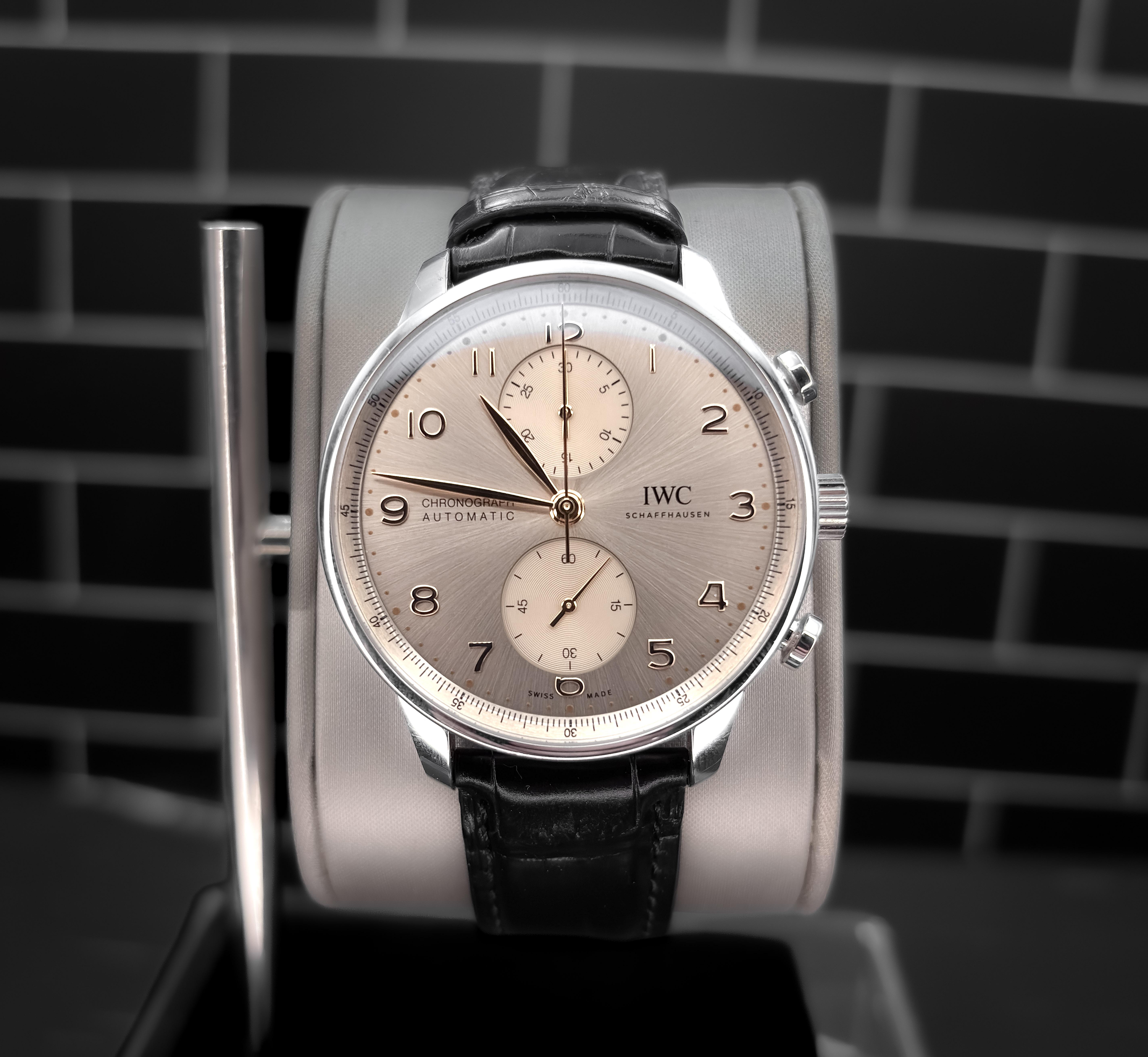 IWC Portugieser Chronograph Ref. IW371624 Stainless steel case with dune dial on black alligator strap. Automatic movement. Pre-owned and in very good condition. Shows normal signs of wear with no major dings, dents, or scratches. Offered as a complete set including box, papers, and all original contents. 41 mm case | Stainless steel case | Automatic | Full set The watch has been inspected and accurately represented. The serial number is intentionally blurred in photos for security bu...