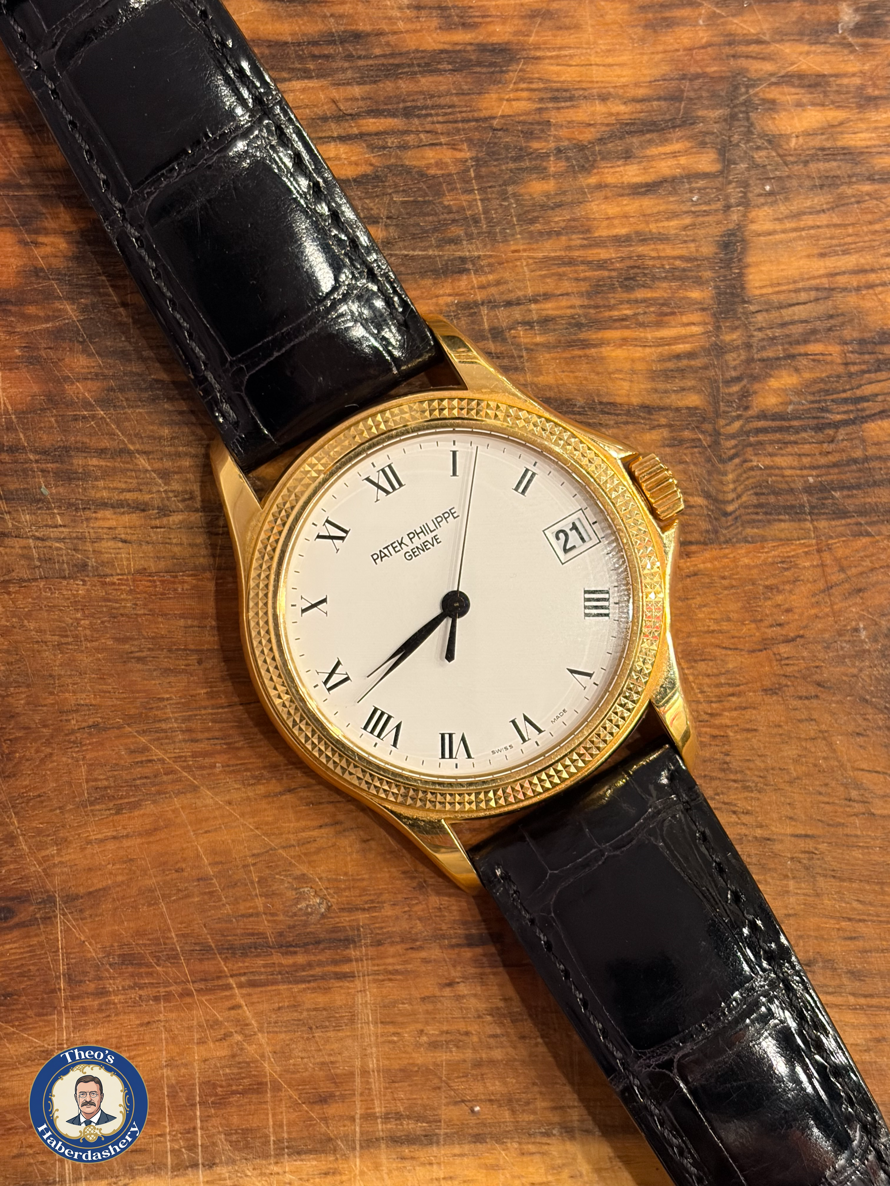 [**Theos Haberdashery**](https://www.instagram.com/theoshaberdash) **| 13 E. 7th St., NY NY 10003** The ref. 5117 was produced from 2000 to 2005 and represents one of the more distinctive Calatravas of its era. Where most Calatravas lean on a smooth bezel, the 5117 adds a Clous de Paris hobnail texture and crown guards, giving it a tactile quality that photographs well but reads even better in hand. 37mm in 18k yellow gold, white dial with black Roman numerals, date at 3. Cal. 315 SC inside, au...