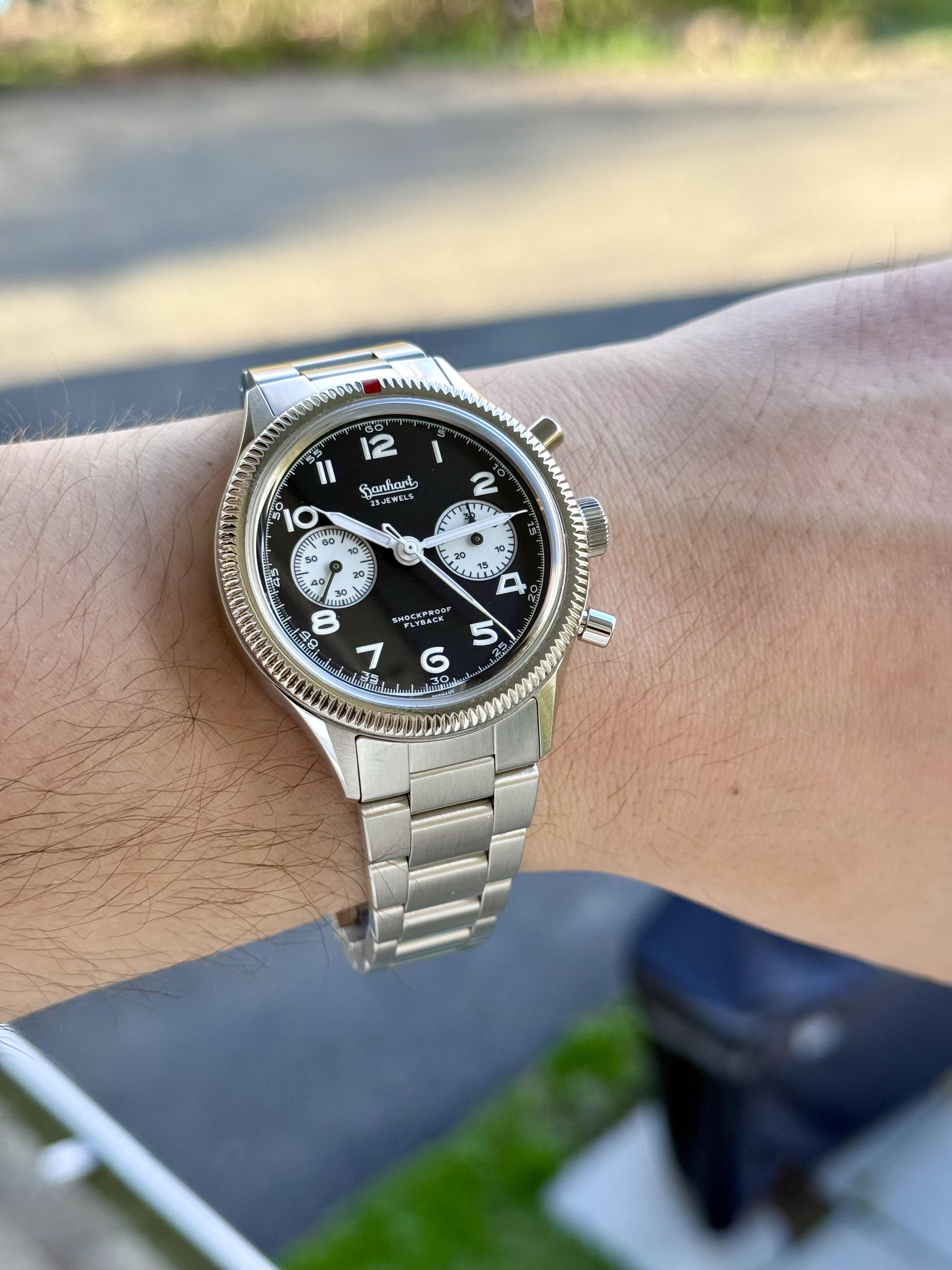 Great condition 42mm Hanhart reverse panda flyback full kit on bracelet with 21mm lugs. Cost over $4300 from Germany on bracelet. Sapphire crystal caseback to see the gorgeous handwound selitta column wheel movement. Great condition. Full kit (box, papers, 2025 warranty card, cloth). $2600 zelled shipped CONUS. Timestamp in last photo. For an extra $100 I will include this 21mm straight end Forstner Bullet bracelet which is basically new and gives the watch a wonderful vitnage/Speedmaster vibe...