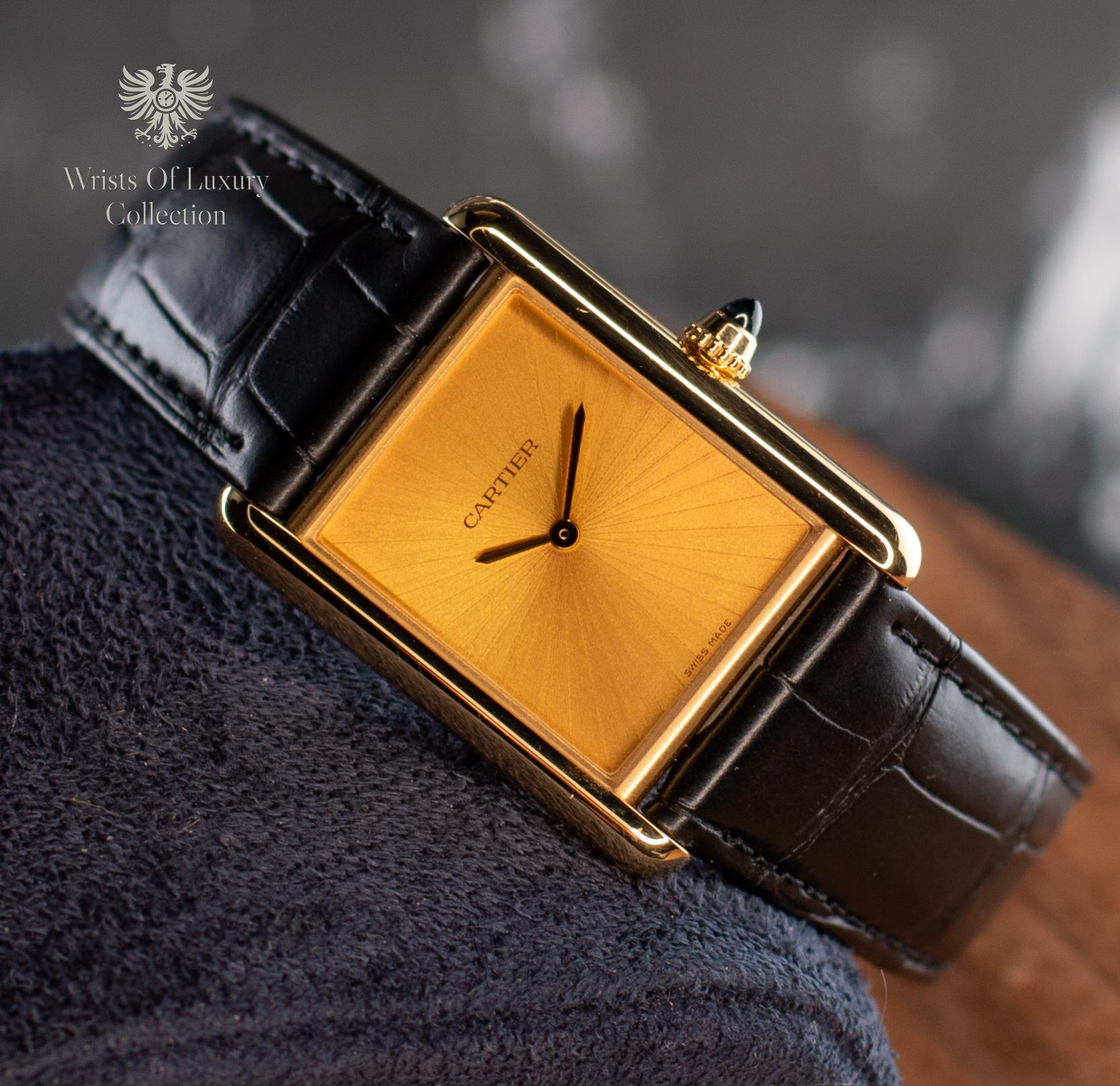 vailable today from the Wrists of Luxury Collection s probably one of the least know Cartier Tank models available currently, and it's quite unfortunate considering it is an absolute stunning timepiece. Crafted with an all gold aesthetic, textures and sheens providing any contrast. The solid 18k gold polished cased, angular sword shaped gold finished steel hands, and a beautiful gold segmented sunburst dial. The dial is definitely the show stopper here, truly exceptional and one of those you nee...