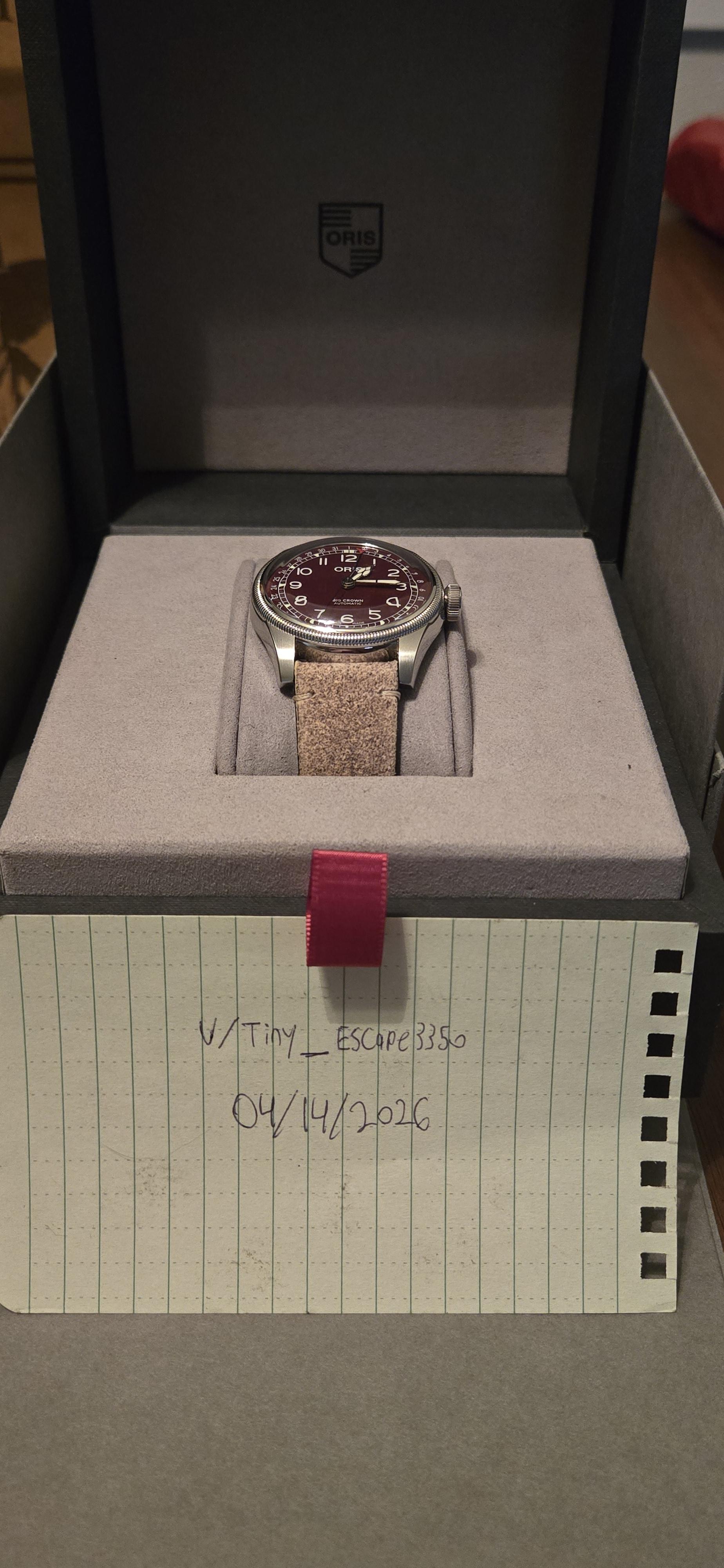 Howdy y'all! Today I'm letting go of a really good piece, my Oris Big Crown Pointer Date, with the "Oxblood" dial! Comes with full box, manual and warranty card! Used to wear this quite a bit, purchased back in late 2022, but I no longer see myself wearing it. Case, finish, and movement are still in excellent condition, however, the bottom suede strap does have wear, as seen in the pictures posted. Although, it STILL wears incredibly comfortable, and still looks great. Asking for a flat $1,00...