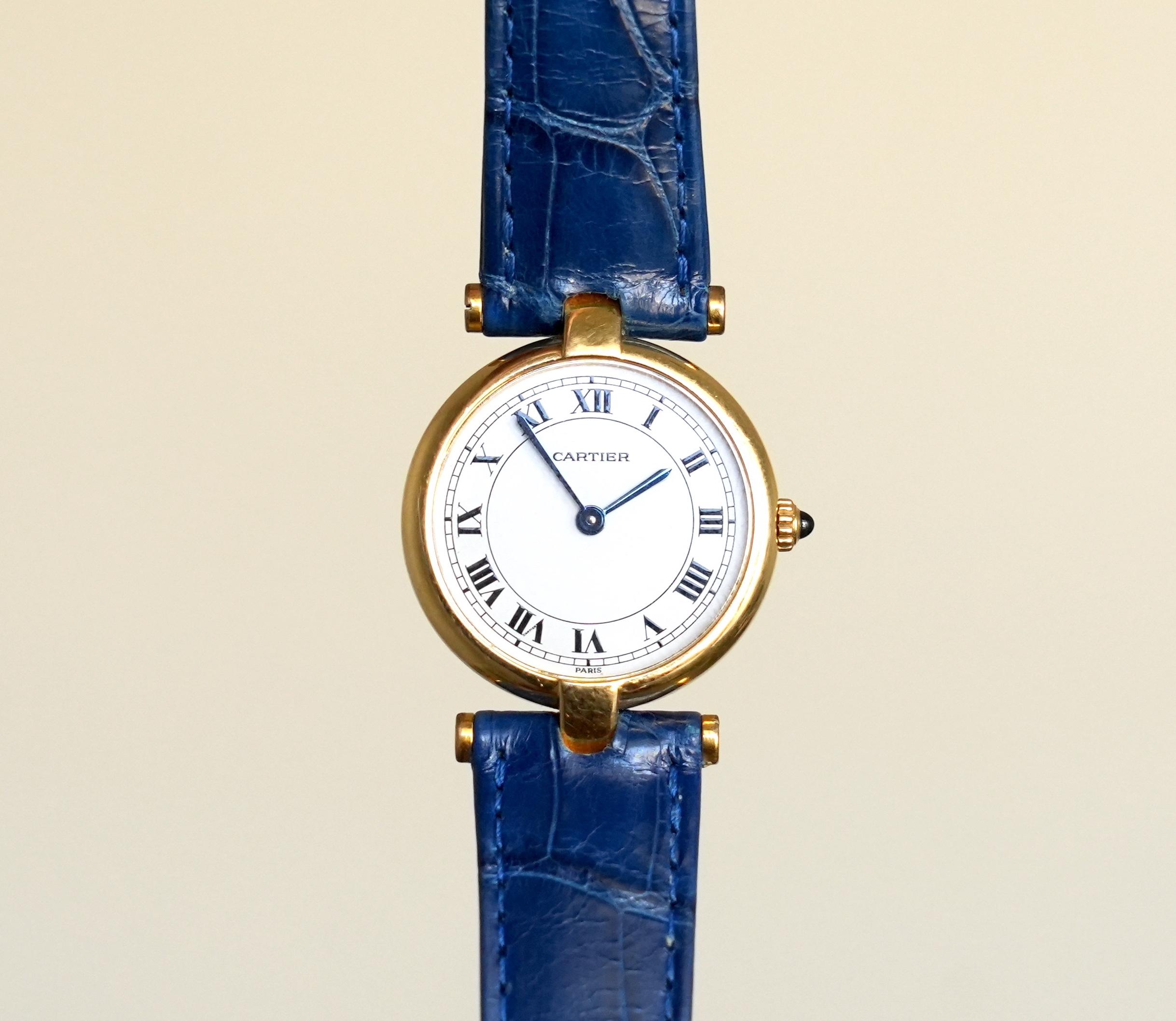 Vintage Cartier Vendome in 18k yellow gold ref. 8100. Clean white lacquer dial, Roman numerals and blued hands, cherry on top - Paris sign. Case 24x30mm 18k solid yellow gold, Blue Vacheron Constantin hand-stitched leather strap and gold-plated buckle. Quartz movement. Album [https://imgur.com/a/u0nAxLX](https://imgur.com/a/u0nAxLX) Timestamp [https://imgur.com/a/XyzWLgc](https://imgur.com/a/XyzWLgc) Asking $2350 shipped insured in US, no trades, located in US