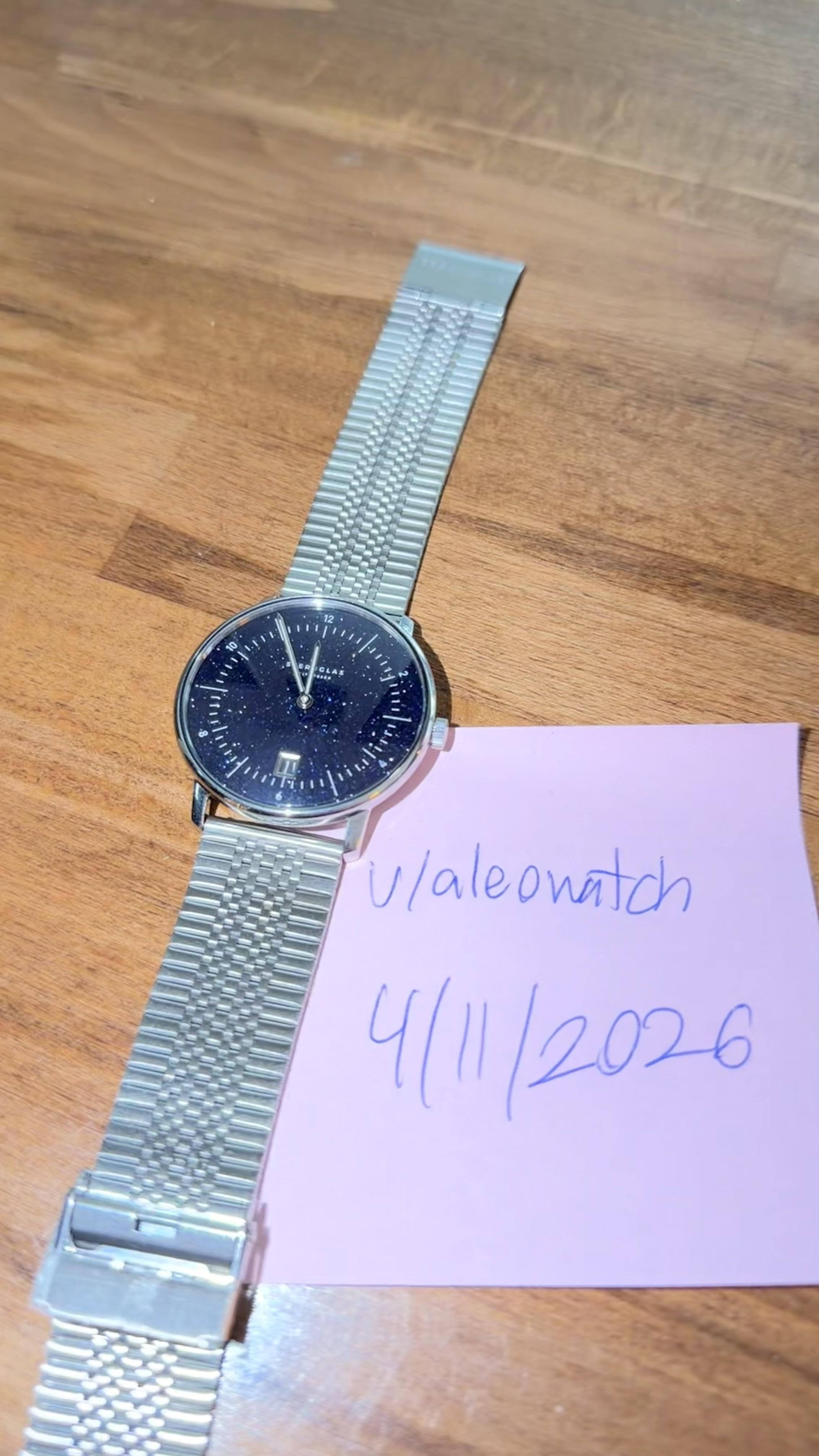 Selling a barely worn Sternglas naos. Watch was worn with a separate leather (not included) and never worn with the bracelet, you can see the sticker is still on the lock on the clasp. Watch is just too dressy for me, despite the gorgeous dial. Looking for $150 USD shipped from Canada.