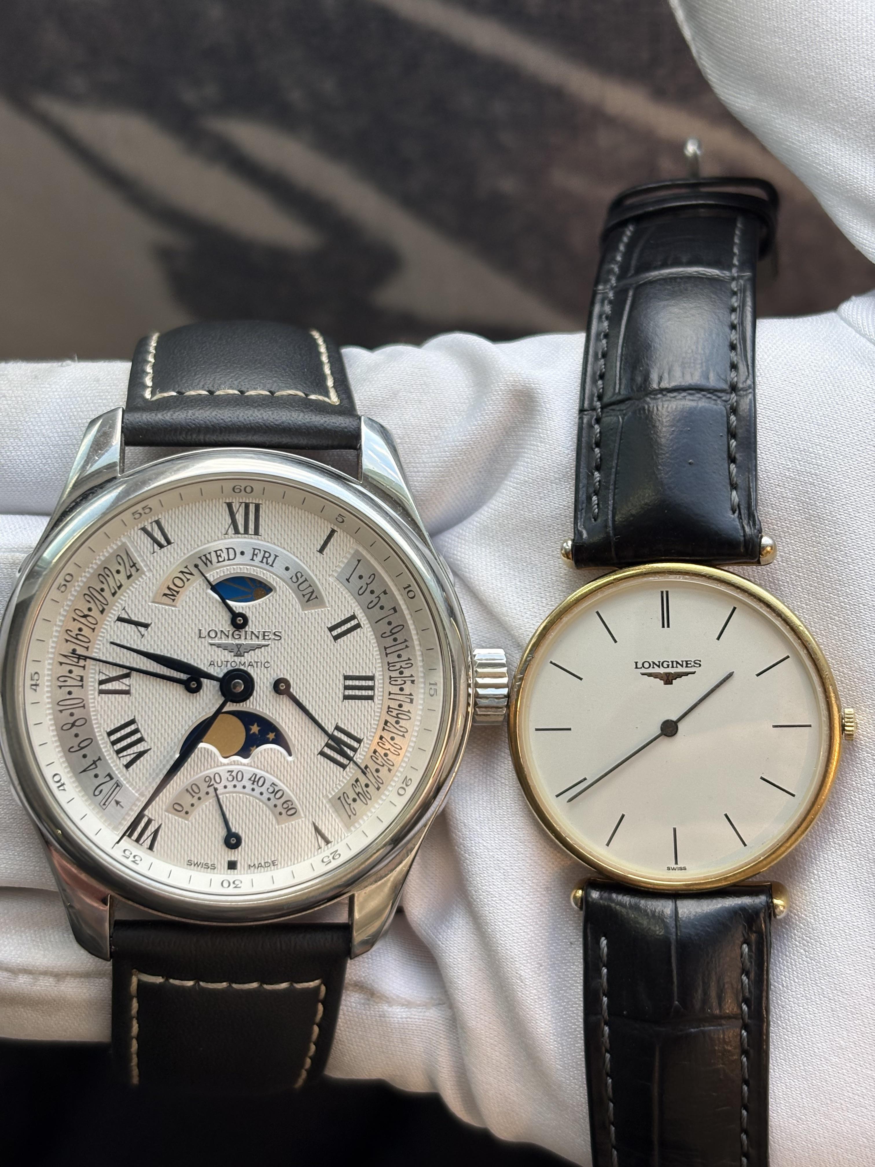 Selling my Longines Automatic Master Collection Retrograde Sun/Moon Moonphase and Longines Quartz La Grande Classique! Both in pre-owned working condition. Longines Automatic Master Collection Retrograde Sun/Moon Moonphase 44mm without crown 22mm lug width. AM Alligator strap with original clasp Original strap is in worn condition and will be provided Cards from ’22 Asking $2800 SHIPPED WORLDWIDE via UPS or USPS Longines Quartz La Grande Classique! 33mm without crown Case thickness...