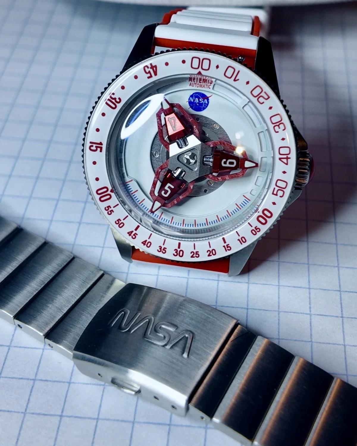 Xeric NASA Artemis Tumbler Automatic Jettison The Artemis Tumbler Automatic watch features a distinctive "tumbling satellite complication" driven by a Miyota automatic 9039 movement. To read the time, the current hour indicator moves along a minute track at the bottom of the dial, pointing to the precise minute. A unique rotating bezel allows users to adjust the minute track display to increments of 5, 10, or 15 minutes, which can then be secured using a screw-down crown. The entire dial, hand...