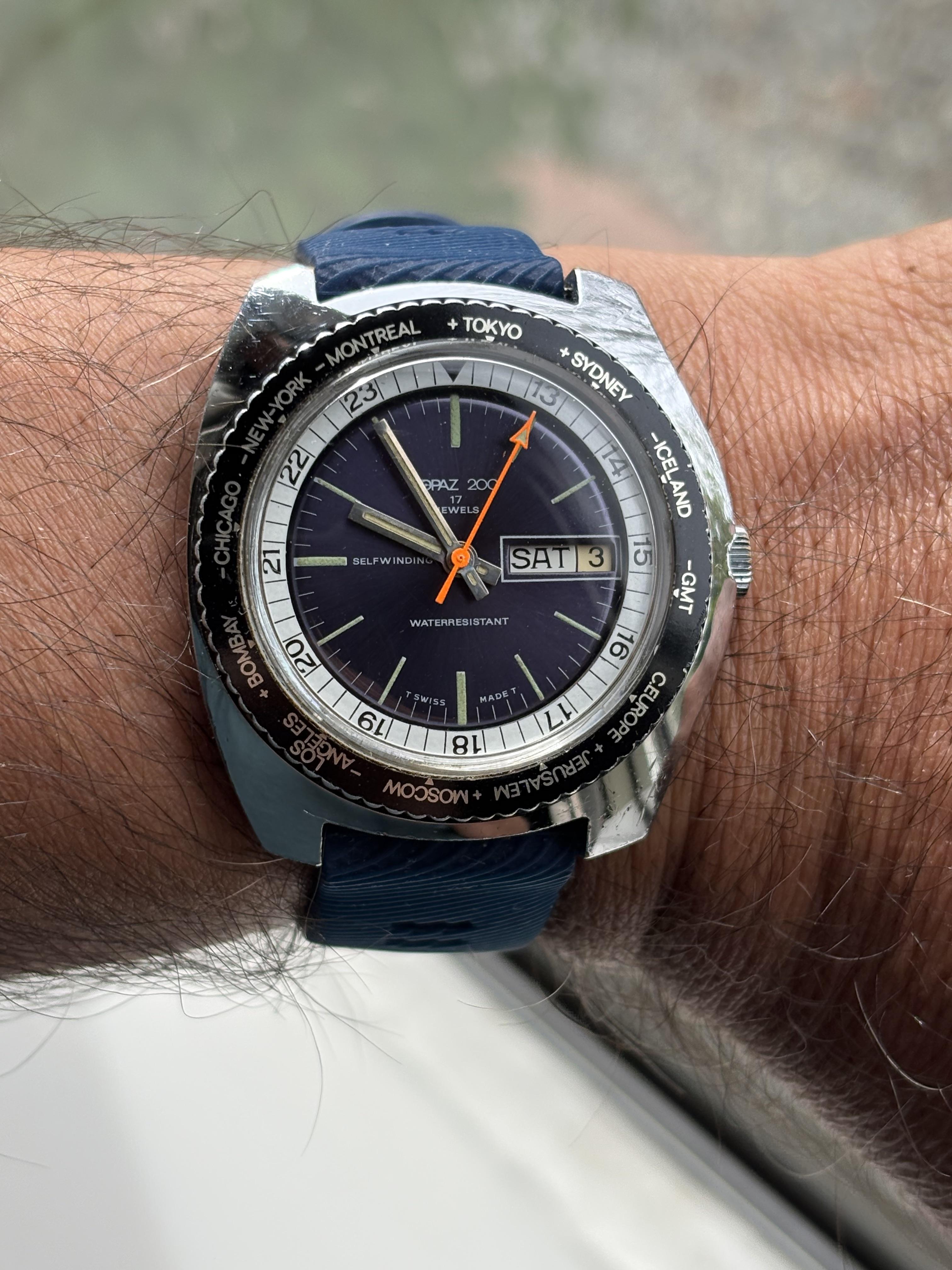 Perfectly accurate vintage Topaz watch. This is made by Sicura, which is a subdivision of Breitling. 40mm, acrylic glass, rubber straps. Asking: $120. Venmo/Zelle/paypal. Thanks for looking.