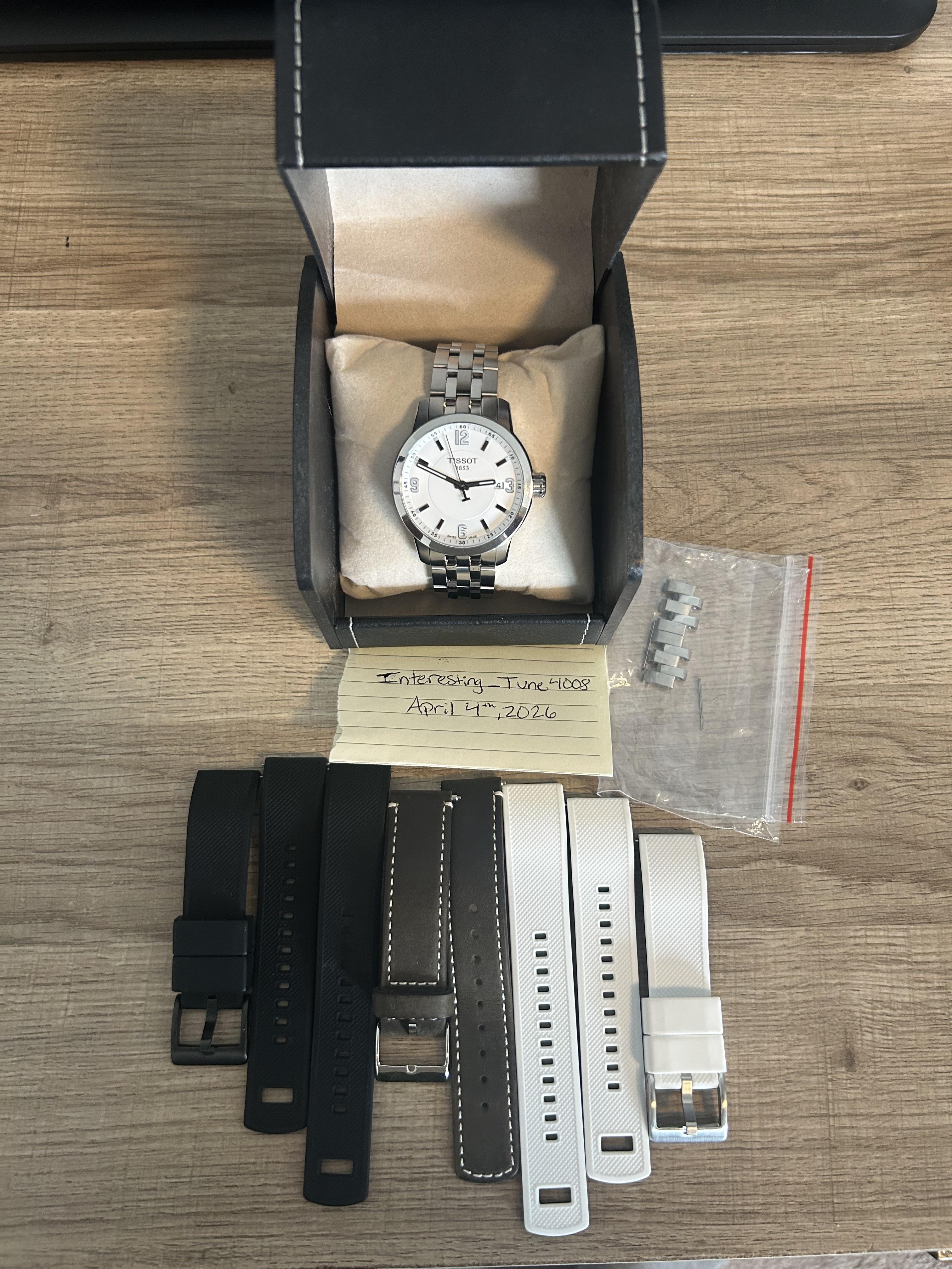 Tissot PRC 200 Quartz Silver/White Dial for sale. Original bracelet with full links, as well as 3 Barton aftermarket straps. The white and black straps are silicon, while the other is top grain leather. Original box and papers not included. Will be shipped in box show in picture. Watch is in excellent condition, barely worn. Screw down crown and 39 mm case. Happy to FaceTime for peace of mind. Feel free to reach out with questions! $200 shipped CONUS