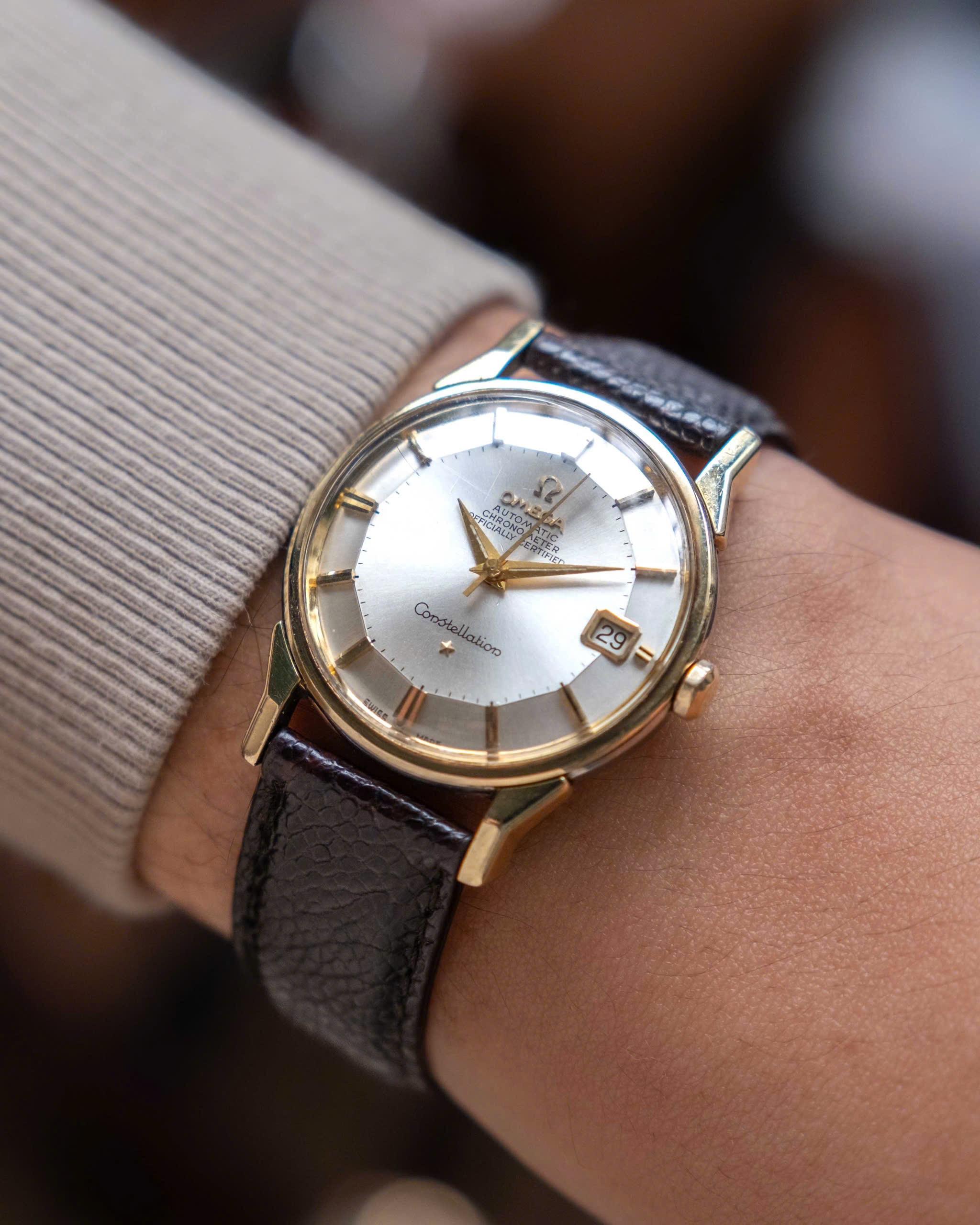 **The Definitive 1960s Chronometer – Precision in Gold and Steel.** The Constellation Ref. 168.005 is widely considered the "golden era" of Omega’s dress watches. This particular example stands out with its pristine silver sunburst dial paired with solid gold faceted indices. The play of light between the sunburst finish and the multi-angled gold markers is simply breathtaking, offering a clean and high-contrast aesthetic. Housing the legendary Caliber 564 quick-set date movement, this piece r...