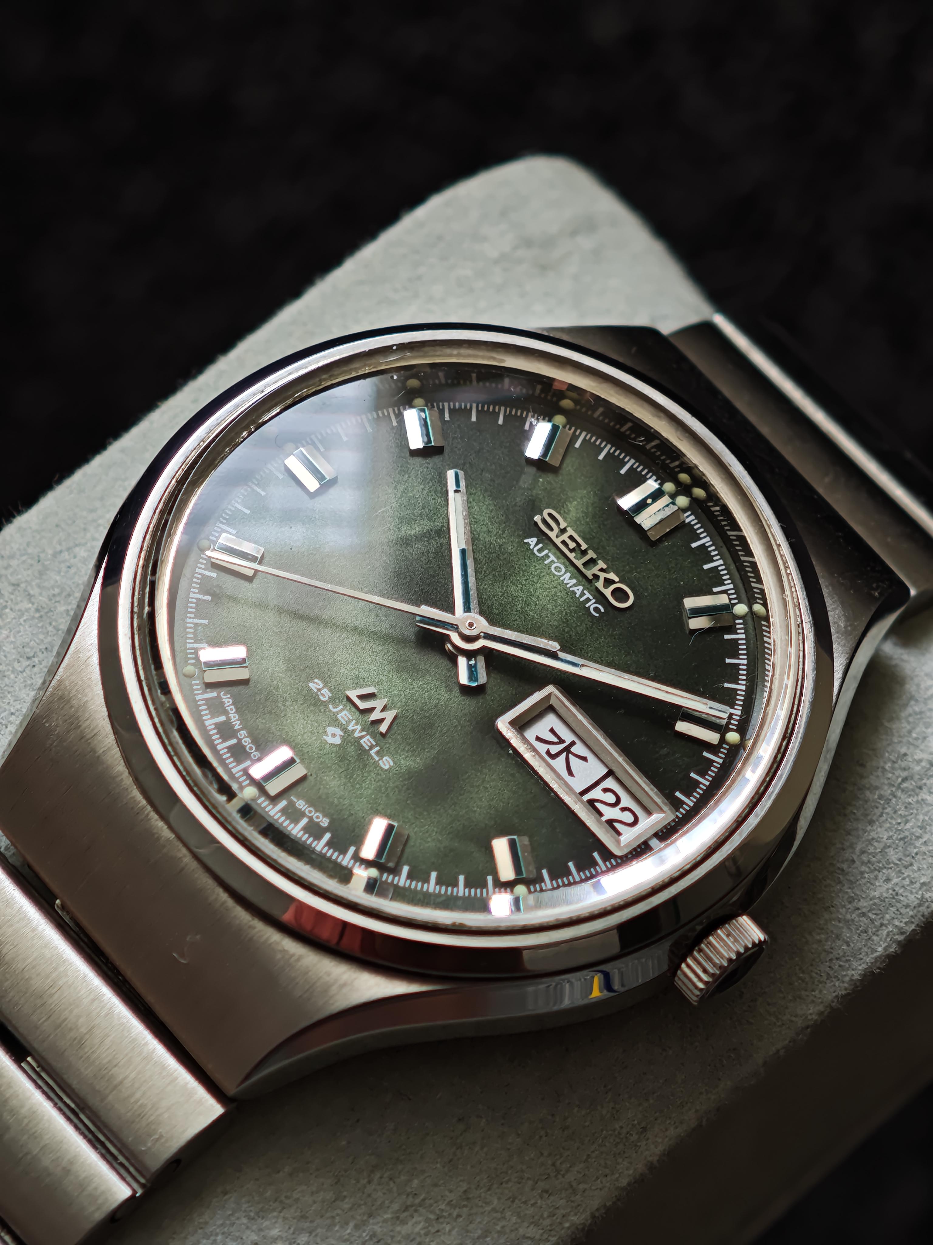Up for sale is a striking Seiko Lord Matic 5606-6040, featuring an uncommon green textured dial often referred to as a “marble” finish. Unlike standard sunburst variants, this dial carries a fine granular metallic texture that creates depth and variation under light—subtle at a glance, but extremely dynamic up close. This example stands out not just for the dial, but for its overall integrity. A clean, well-preserved piece paired with the original bracelet and Kanji day wheel, representing Seiko...