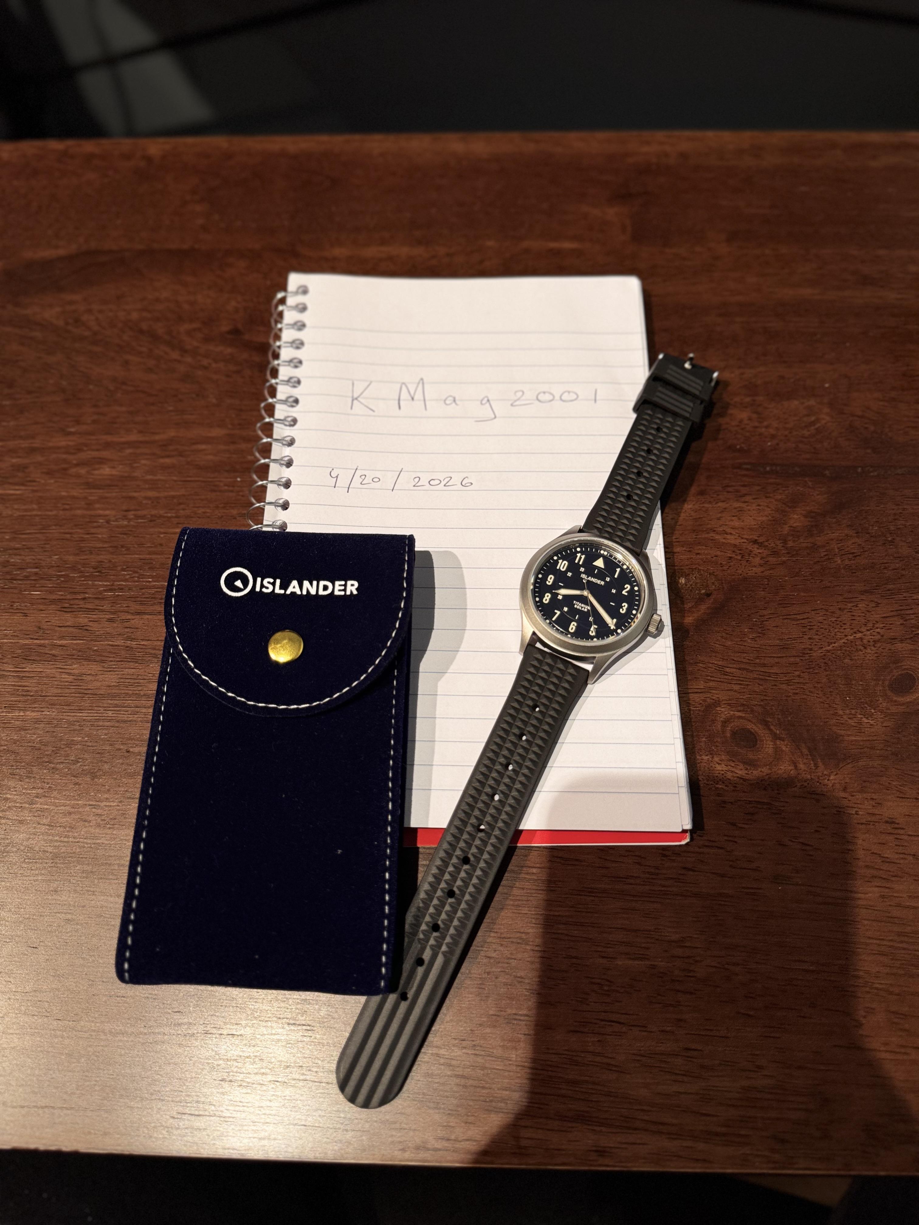 Repost. Reduced. Islander Babylon - $215 OBO (includes 2 day FEDEX shipping). **Islander Babylon** \- Purchased new in March 2026 (still in warranty) from Marc (Long Island Watch) at District Time Watch is in excellent condition. Original sailcloth strap included + high quality BlueShark Waffle Strap. Carrying pouch this was sold in included.