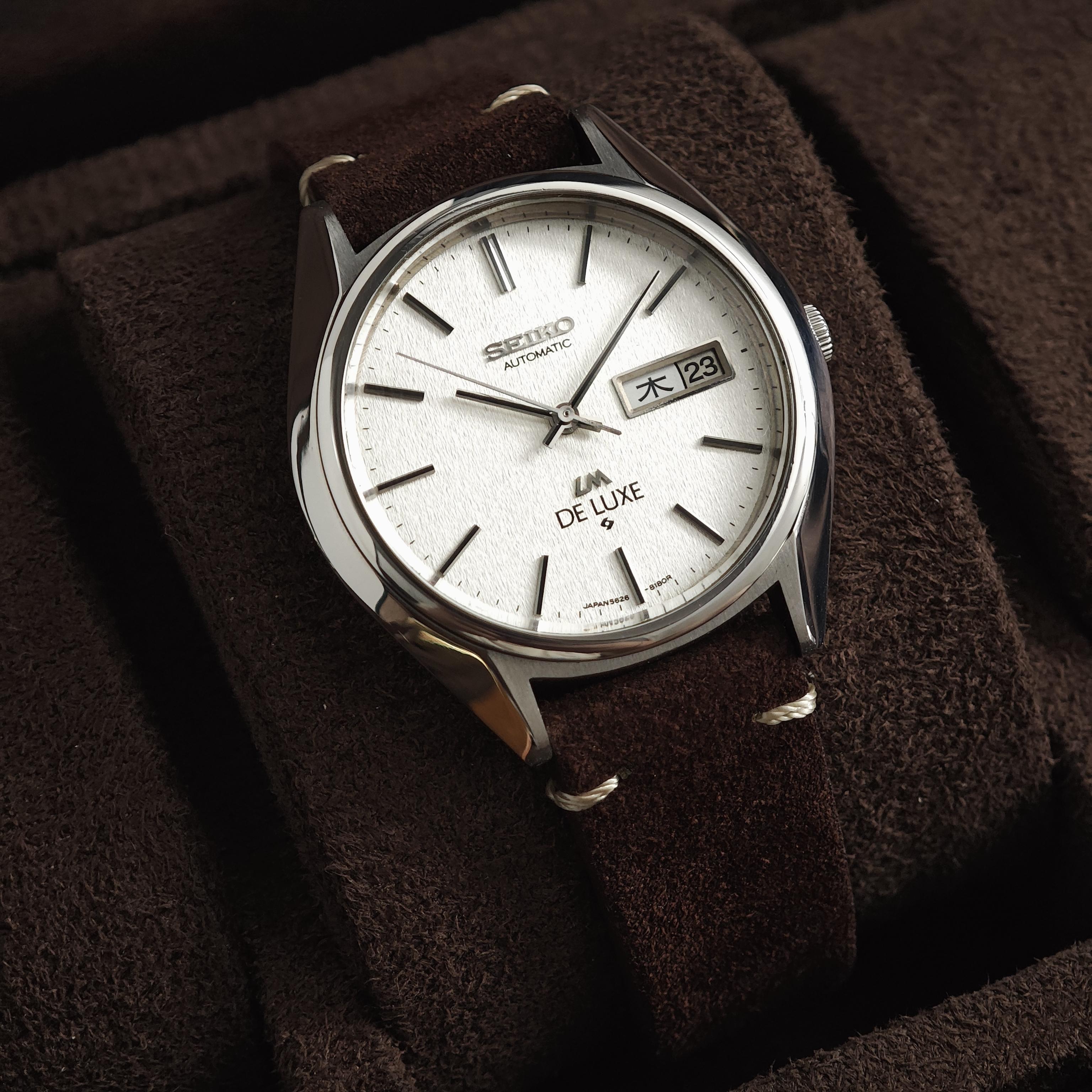 Up for sale is a 1975 Seiko Lord Matic De Luxe 5626-8140 with a beautiful snowflake dial. The LM Deluxe is the only Lord Matic featuring a King Seiko movement. It was released shortly after the discontinuation of the King Seiko and Grand Seiko lines in the 1970s. I believe Seiko used the remaining 5626 movements for these LMs, which were produced until 1976 before Seiko shifted its focus entirely to quartz watches. The infamous plastic quickset star of the 56xx has been replaced with a metal o...