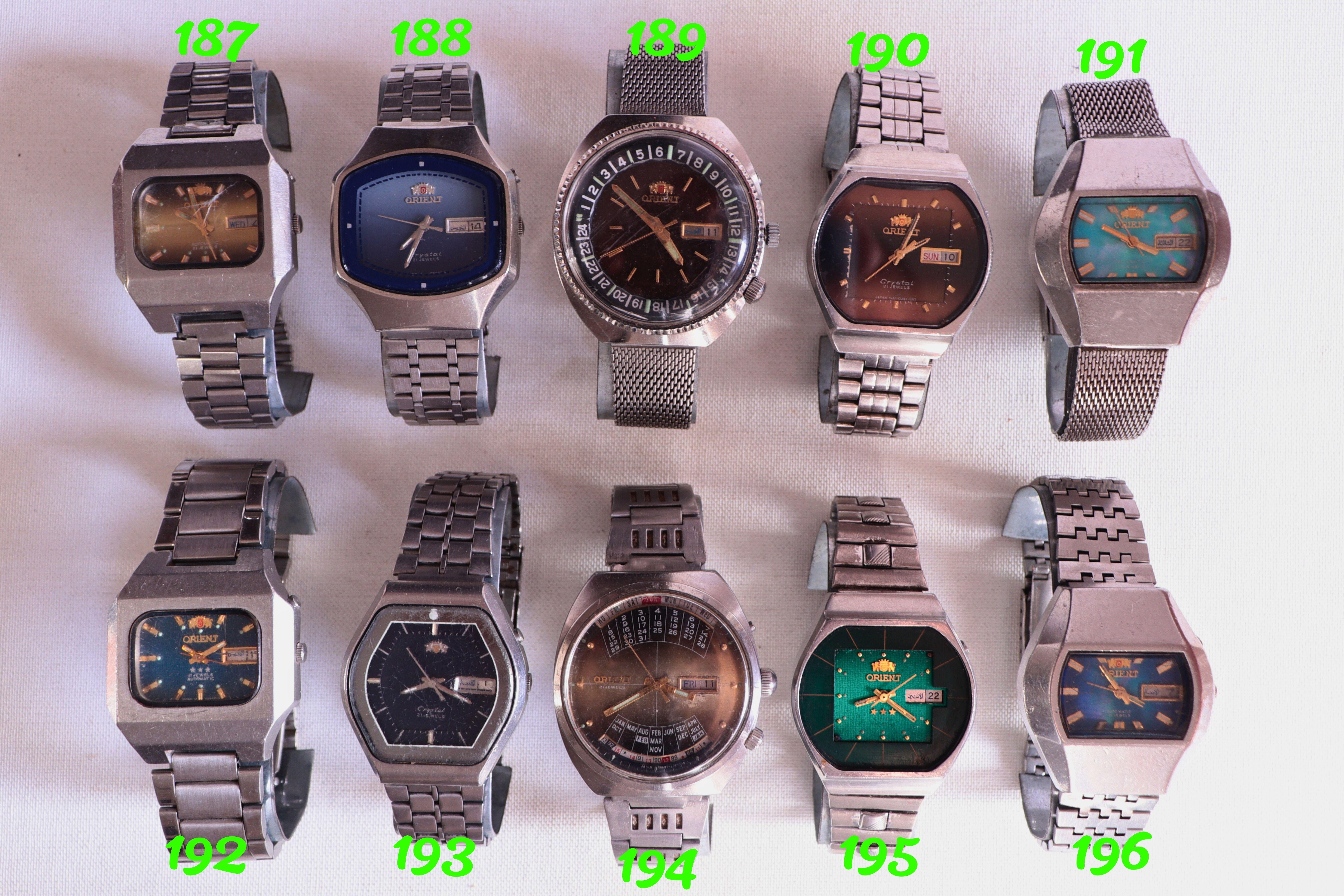 Hello everyone, I am liquidating a significant part of my Orient collection to clear stock immediately. This is a great opportunity to grab authentic, fully functional Japanese timepieces at clearance prices. The Collection Quantity: 40+ original Orient watches (numbered 179-216 in the photos). Condition: All watches are in full working order. Cosmetic State: Ranges from Good to Excellent. Variety: Includes many vintage Crystal 21 Jewels, 3-Star models, Multi-Year Calendars, and ...