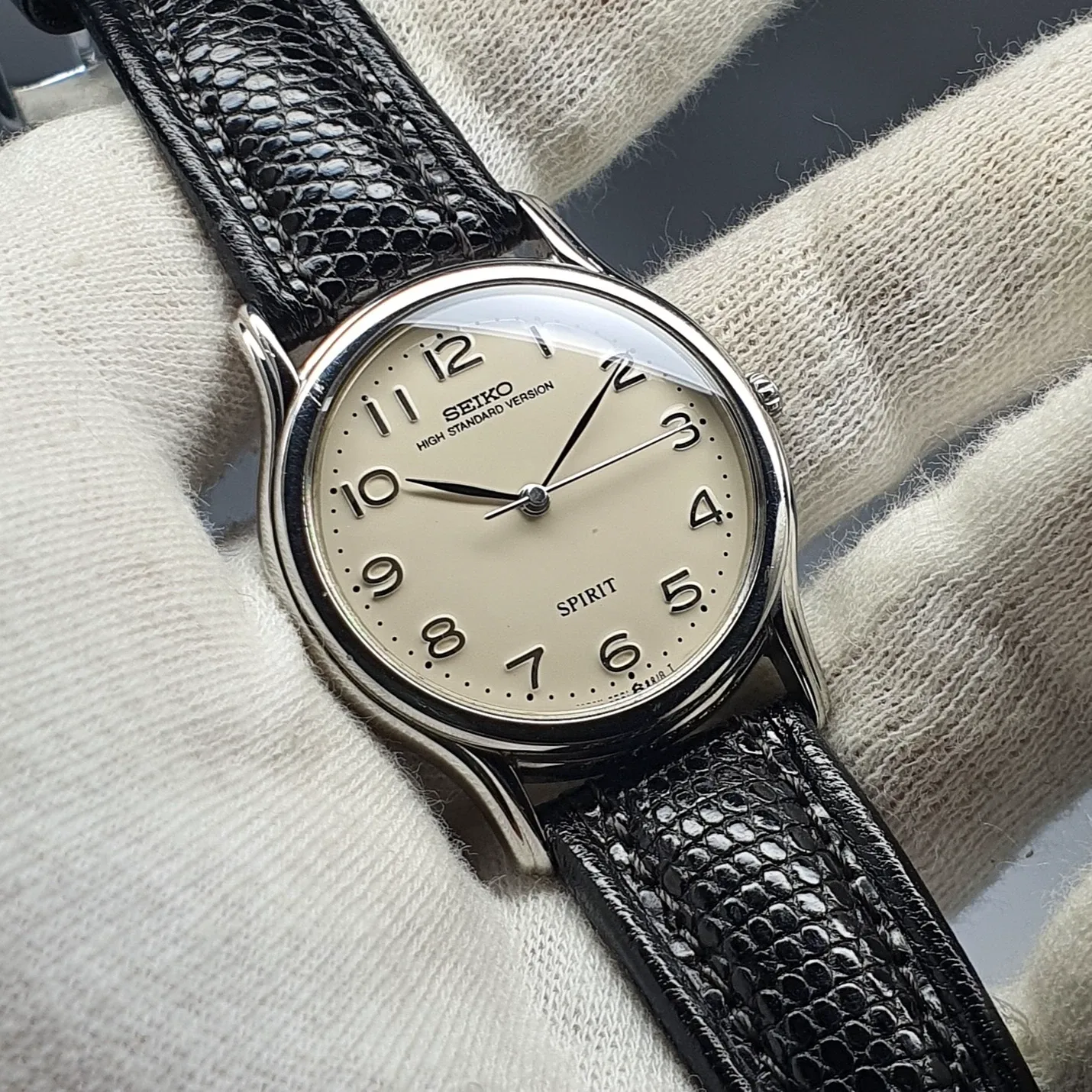 Hey WatchEx! Description below: For sale is this vintage Seiko Spirit "High Standard Version" (5E31-6A10), made in Japan in November of 1989. The "Spirit" series by Seiko was made to embody the spirit of time-keeping by keeping designs classic, legible, and having only essential functions. This is part of the "High Standard Version" line within the Spirit line, which are the high-end versions of Spirit models that include luxuries such as HAQ (High Accuracy Quartz) movements, sapphire crystals...